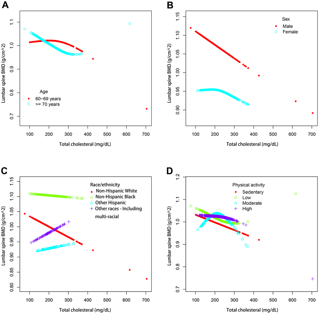We also performed weighted generalized additive models and smoothing curve fitting to assess their association (Figure 2). Figure 2 shows that total cholesterol is linearly negatively correlated with lumbar bone mineral density. We also performed smooth curve fitting in subgroups stratified by categorical variables (Figure 3). Figure 3A shows that there is a turning point in the fitting curve for elderly people older than or equal to 70 years old, at a total cholesterol of 280 mg/dL (Supplementary Table 2). Figure 3D shows that the fitting curve of older people with more than moderate physical activity has a turning point, at a total cholesterol of 199 mg/dL (Supplementary Table 2). Other turning points are shown in Figure 4 and Supplementary Table 2.