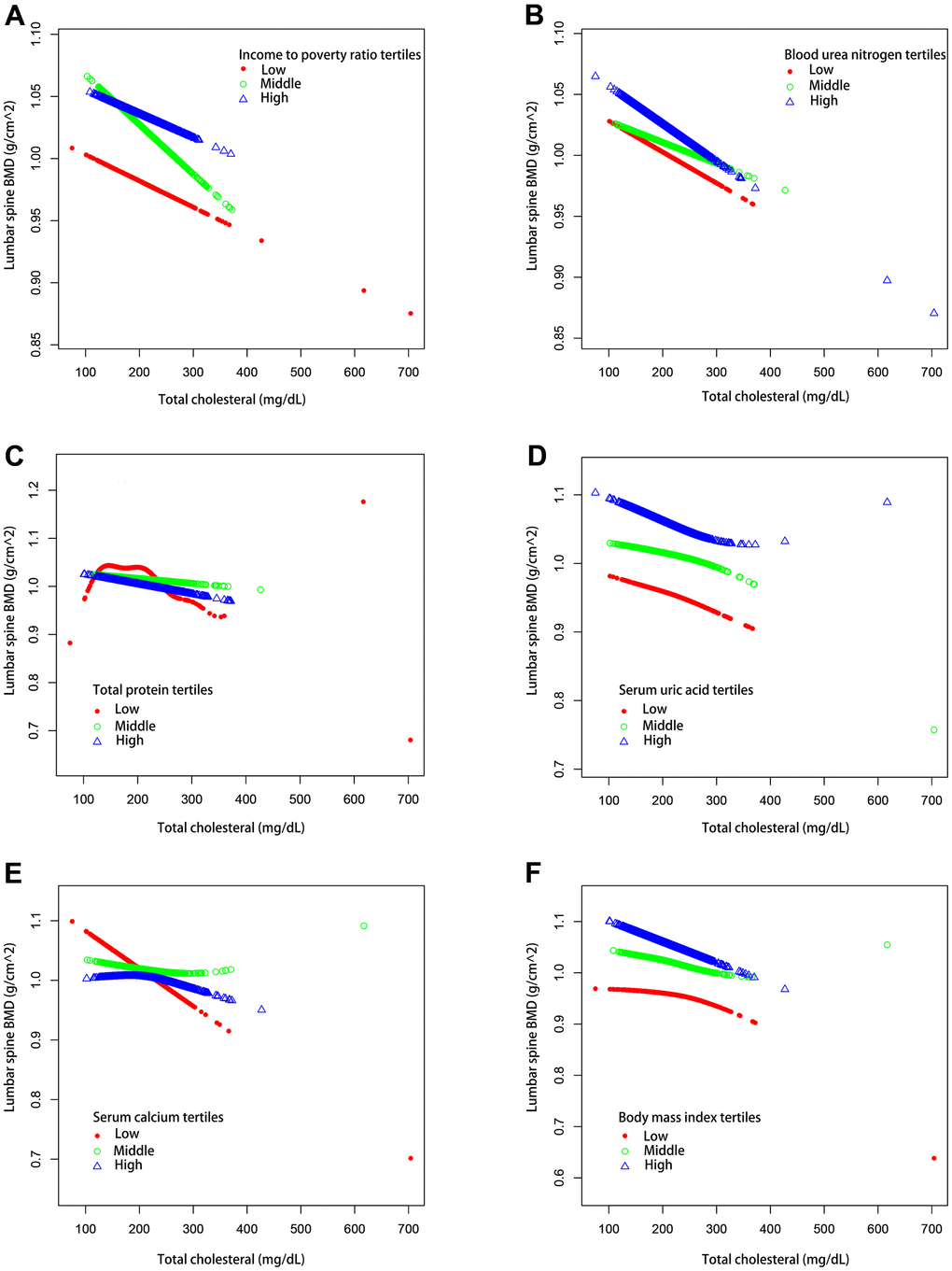 The exposure variable for this study was serum total cholesterol. In the mobile examination center (MEC) laboratory, blood specimens are processed, stored, and shipped to the Johns Hopkins University Lipoprotein Analytical Laboratory for analysis. The outcome variable was lumbar spine BMD, measured by DEXA. The following categorical variables were included as covariates in our analysis: age, sex, race / ethnicity, physical activity. Continuous covariates were included in our analysis: income poverty rate, blood urea nitrogen (BUN), total protein, serum uric acid, blood calcium and body mass index (BMI). Detailed information on total cholesterol, lumbar spine BMD, and covariates is available in http://www.cdc.gov/nchs/nhanes/ Available publicly.