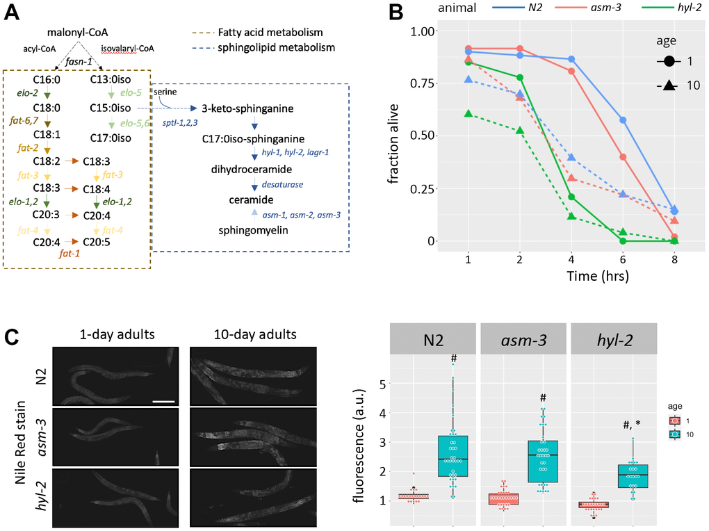 To determine whether sphingolipid metabolism itself is altered by age, we examined key enzymes in the production of sphingolipids from mmBCFAs. The mmBCFA C15iso and C17iso fatty acids can be made into C17iso-sphinganine or its precursors through serine palmitoyl transferase (sptl-1) in C. elegans (Figure 1A) [54, 55]. We found that sptl-1/serine palmitoyltransferase does not change with age or strain (Figure 6A). The addition of fatty acid to C17iso-sphinganine to make dihydroceramide is mediated by hyl-2, as well as other ceramide synthases (Figure 1A). hyl-2 specifically transfers fatty acids of shorter chains (C20-22) [40]. We further explored gene expression changes of hyl-2 and asm-3 itself, and found that asm-3 showed a trend to decrease in N2 animals at 10-days compared to 1-day (Figure 6A). However, we observed that, in general, asm-3 had low expression in all genotypes at 10-days. Interestingly, there was a large 10-day to 1-day decrease in asm-3 expression observed in hyl-2 animals. Thus, it is possible that hyl-2 animals, and old animals in general, have reduced breakdown of sphingomyelin at older ages that contribute to their poor stress response and reduced lifespan. However, given that asm-3 mutants have increased lifespan, it is not clear how reduced asm-3 expression at later ages may specifically modify aging processes differently than complete knockouts. Together, these data support a model where increased abundance of sphingolipid precursors and sphingomyelin may contribute to poor aging phenotypes. Indeed, our findings support lipidomic analyses of human longevity suggesting that centenarians upregulate mechanisms to upregulate sphingomyelins to ceramide-containing glycosphingolipids [56, 57].