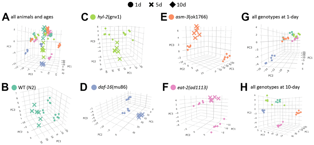 To visualize how age affects lipidome changes, we first examined how well lipidomes clustered by age or genotype using principal components analysis (PCA). For this analysis, raw concentrations of each lipid were log2 transformed and analyzed. We found that within each genotype, animals from each age group clustered most closely with animals from the same age group (Figure 2A–2F). This suggests that age is a major driver of lipid profiles regardless of genotype. Interestingly, when analyzing the PCA plots by age, genotypes appear to cluster more closely at 1-day, except daf-16 mutants which appear to cluster away from the rest (Figure 2G, 2H). This visual representation suggests that as animals age, their lipid profile may become more distinct by genotype. Thus, we performed more detailed analysis of specific changes.
