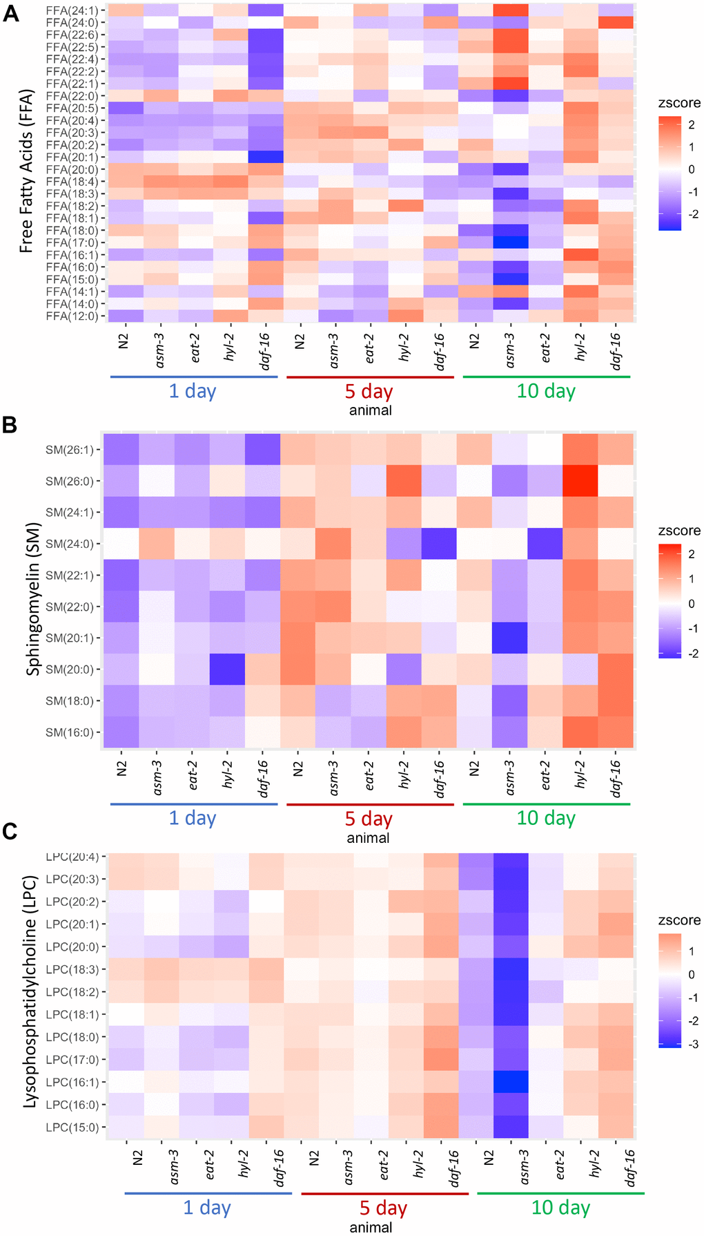 Next, we determined whether age affected the lipidome within specific classes of lipids. To do this, we visualized lipid concentrations through heatmaps of free fatty acids (FFA) in N2, asm-3, and hyl-2 mutants (Figure 3A). Wildtype N2 animal show decreases in many shorter chained FFAs, particularly saturated FFA. The largest decreases were in FFA(20:0) (log2FC = -2.6, FDR=1.60e-15), FFA(18:0) (log2FC = -2.5, FDR=2.61e-19) (Supplementary Tables 2, 5). This observation is more pronounced in asm-3 mutants. However, hyl-2 mutants show increases in FFA of most types from 1 to 10 days, including many of shorter chained saturated and unsaturated FFAs; this is similar to the short-lived daf-16 mutant. Interestingly, long-lived eat-2 and daf-2 mutants have been shown to have lower amounts of shorter chained fatty acids (C14:0 - C20:0) [6], suggesting that shorter chain FA may contribute to aging. However, very long chain polyunsaturated FFAs increase with age in wildtype animals (Figure 3 and Supplementary Tables 2, 5). The largest changes of FFA from 1 day to 10 day N2 were in polyunsaturated FFA(20:2) (log2FC = 2.3, FDR=1.99e-34) and FFA(22:5) (log2FC = 1.30, FDR=1.75e-14). Interestingly, asm-3 mutants exhibit increases in many of the longer chained FFAs at 10 days compared to 1 day (Figure 3A and Supplementary Tables 3, 8).