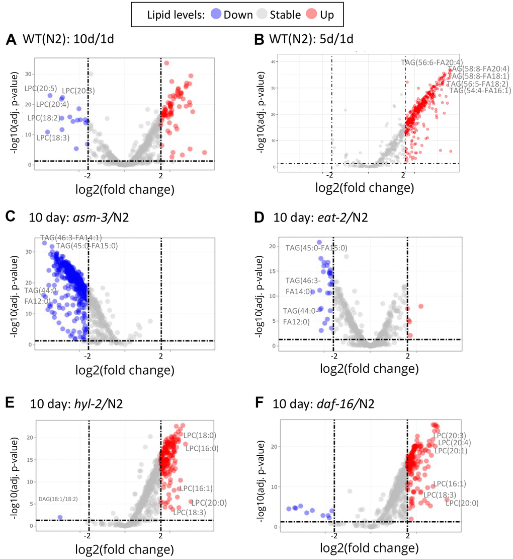To explore specific lipid changes associated with age, we next examined fold changes of each lipid molecule using volcano plots, plotting their concentration to their false discovery rate (FDR, or adjusted p value). Those lipids with greater than a 4-fold change (log2 FC > 2) are highlighted in Figure 4 (and Supplementary Tables 2–9). First, we examined changes in 10-day old N2 animals compared to 1-day old animals (10d/1d; Figure 4A); many of the lipids that are lower at 10 days compared to 1 day were LPCs, whereas many of the lipids that were higher at 10 days were triacylglycerols (Figure 4A). When examining changes in 5-day old N2 animals compared to 1-day animals, we observed similar changes in triacylglycerols, but not LPCs (Figure 4B). Next, we compared lipidomes of 10-day old animals of hyl-2, asm-3, daf-16, and eat-2 backgrounds to that of wildtype 10-day animals (Figure 4C–4F). Strikingly, the lipid changes in asm-3 to N2 were similar to that of the long-lived eat-2 to N2. Most of the highly significant changes were found to be lower levels of TAGs. Indeed, eat-2 animals exhibit reduced TAG levels by Nile Red, Oil red O, and Sudan black staining, as well as gas chromatography [46, 47]. On the other hand, the profile of lipid changes in hyl-2 to N2 was similar to that of the short-lived daf-16 to N2. Both 10-day old hyl-2 and daf-16 showed increases in LPCs compared to 10-day wildtype, sharing many common LPCs including LPC(16:1), LPC(18:3) and LPC(20:0).