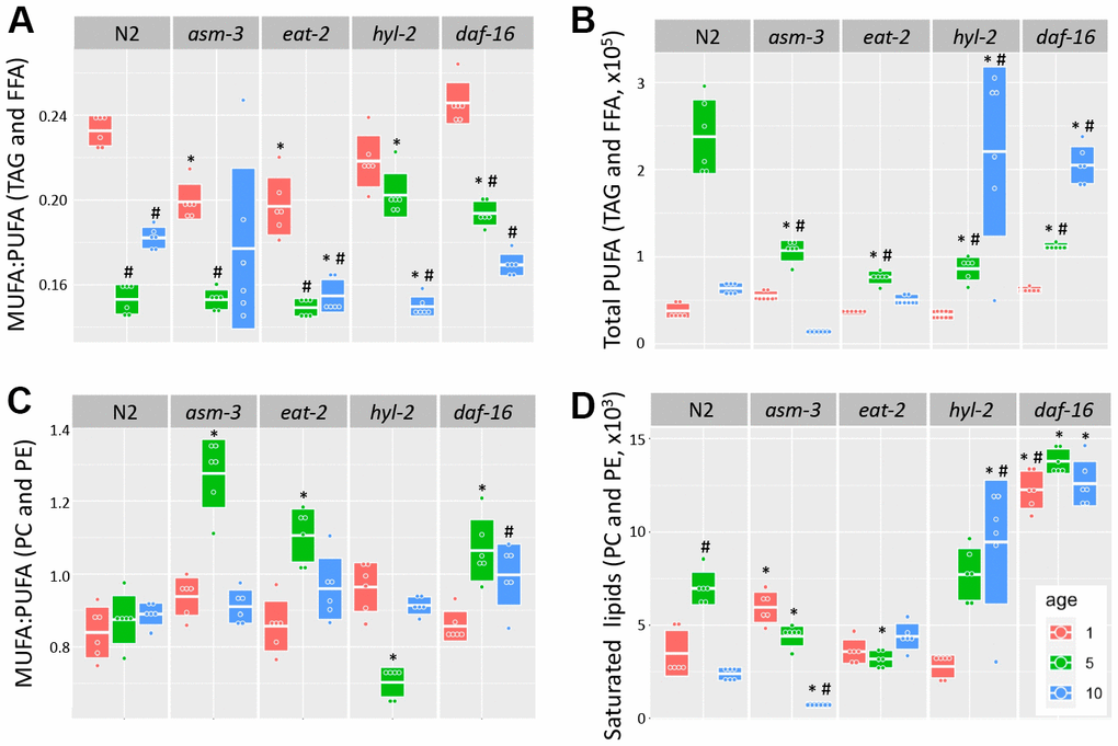 Fatty acid chain desaturation has been of interest in aging because polyunsaturated fatty acids (PUFAs) may be more susceptible to oxidation and cellular damage, suggesting that high levels of PUFAs may be detrimental to health. Indeed, older animals have a decreased monosaturated fatty acid to polyunsaturated fatty acid (MUFA:PUFA) ratio, suggesting that there are more PUFAs, or less MUFAs, with age; in addition, long-lived animals generally have a higher MUFA:PUFA ratio compared to short-lived animals [35, 36, 50]. We analyzed TAG and FFA and found that the MUFA:PUFA ratio declined in older ages for all genotypes (Figure 5A). However, when we analyzed total PUFAs, we found that both hyl-2 and daf-16 mutants had higher amounts of PUFAs than 10-day N2 animals (Figure 5B, 3.46 fold and 3.22 fold, p<1.0e-7 respectively). Both hyl-2 and daf-16 had PUFA levels at 1 day comparable to N2, but PUFA levels continued to increase significantly at each timepoint. Both asm-3 and eat-2 had non-significant changes at 10 days compared to N2. The changes in MUFA:PUFA ratio in older animals was not observed when we analyzed saturation levels in PC and PE (Figure 5B). However, we did find that hyl-2 and daf-16 mutants also had increased amounts of saturated lipids found in PC and PE (Figure 5D, 3.96 fold, and 5.28 fold increase respectively; p<1.0e-7 for both).