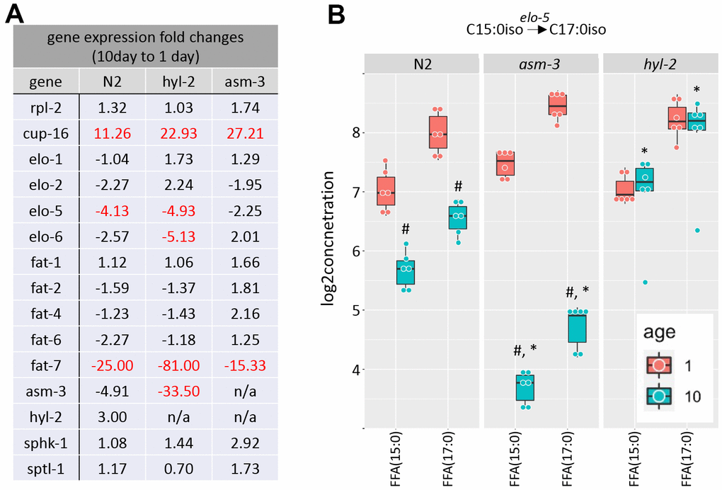 We found that the lipid levels of the FFA(15:0) and FFA(17:0) is increased in 10-day hyl-2 (log2FC=1.28, p=1.66e-10; Figure 6B) and daf-16 (log2FC=2.55, p=2.50e-23) mutants compared to N2. On the other hand, asm-3 animals showed decreases in FFA(15:0) and FFA(17:0) (log2FC=-1.98, p=1.10e-18) (Figure 6B). We were interested in whether the differences in these chains are also observed in triacylglycerols (TAGs). When analyzing FA15:0 and FA17:0 chains that are part of TAGs in asm-3 animals, we found that they also exhibited decreased TAGs containing FA15:0 and FA17:0 at 10-day compared to 1-day; hyl-2 mutants showed a general increase in in these TAGs compared to N2, but not in either specific day (Supplementary Figure 4). Although our lipidomics detection could not identify the iso-branched species specifically, this suggests that hyl-2 might have higher mmBCFAs at older ages, whereas asm-3 mutants have lower.