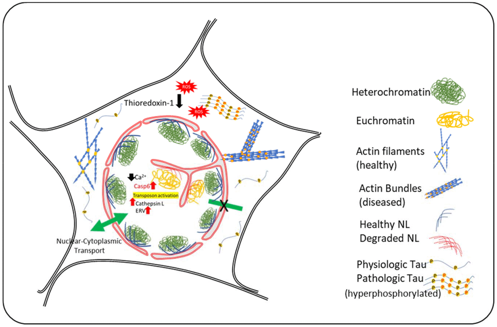 Research in the field of neurodegeneration has generally ignored the nucleus and instead has focused on neuronal cytoplasmic events. Evidence of nuclear involvement in AD has been shown by chromatin modifications and epigenetic changes that can be effectively inhibited by histone modifiers resulting in cognitive improvement in animal models [1]. The dynamic changes in neuronal nucleus and its response to various internal and external stressors in pathophysiology of AD have been recently reviewed [2]. The authors have detailed physical changes and stress-related responses including epigenetic changes that occur in neurons and will not be duplicated here. Changes in neuronal nucleus in AD also include interruption of mitochondrial-nuclear interaction through interruption of nuclear coded antioxidant proteins. Mitochondrial genome carries the genetic materials required for the oxidative phosphorylation machinery proteins, which are also the major source of ROS. The antioxidant machinery responsible for scavenging these ROS is provided by the nucleus. In neurons, high levels of ROS and mitochondrial activity are more important and must be closely regulated. In AD, decreased level of peroxisome proliferator–activated receptor γ coactivator 1α (PGC-1α) a master regulator of antioxidant proteins, impairs the functional interaction between mitochondria and nucleus [3]. Another implication of nucleus in pathophysiology of AD is attributed to changes in neuronal nuclear pore components. Nuclear pore complexes have a sophisticated structure and are the gatekeepers for transport of proteins and RNAs from nucleus to cytoplasm and vice versa. Although small proteins (<40kDa) can freely cross the pore, larger proteins rely on transport using a special group of GTP-binding nuclear protein also known as Ran-GTP. This has been shown to be interrupted after exposure to oxidative stress [4] or following accumulation of hyperphosphorylated tau in several neurodegenerative diseases including ALS, Huntington’s and AD. For a detailed review see Eftekharzadeh et al. [5]. While biochemical assays have extensively shown the involvement of nuclear envelope in regulation of chromatin compaction and gene regulation, a physical link between tau and nuclear damage in pathology of AD was originally reported by Feany’s group [6], by identifying coffee-bean shaped neuronal nuclei when stained for lamin-B1 protein. Understanding the upstream molecular mechanisms causing the nuclear lamina damage, and the downstream events that are involved in pathophysiology of AD may lead to identifying new treatment strategies.