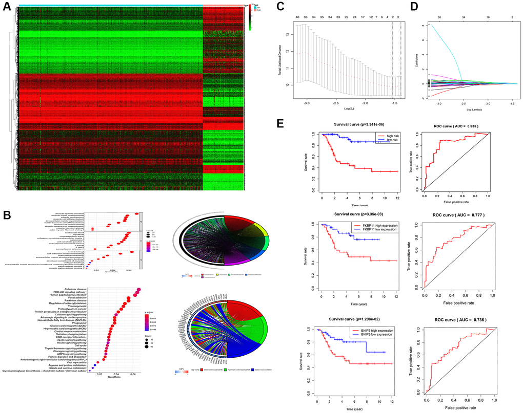 A large number of genes showed greater than 4-fold increases in expression between osteosarcoma tissues and normal tissues. GO and KEGG enrichment analyses were performed on these genes. This analysis revealed that FKBP11 controls the transcription of multiple invasion- and metastasis-related genes, such as integrins, matrix metalloproteinases (MMPs), and A Disintegrin and Metalloproteinase (ADAM) proteins, as well as the TGF signaling pathway, which is the most differentially enriched pathway between osteosarcoma tissues and normal tissues at the transcriptional level. GO enrichment analysis revealed that the differentially expressed genes were mainly enriched in muscle system processes, muscle contraction, extracellular matrix organization, rhabdomyocyte differentiation, and muscle organ development. KEGG enrichment analyses revealed that the differentially expressed genes were mainly enriched in dilated cardiomyopathy, hypertrophic cardiomyopathy, and myocardial contraction. Two genes, FKBP11 and BINP3, were finally screened by univariate Cox analysis, LASSO regression analysis, and multivariate Cox regression analysis. Then, we constructed a risk assessment model, which was used to draw a scatter plot of survival time for the whole cohort. Finally, we performed univariate and multifactorial analyses to determine the association of patient sex, patient age, tumor stage, tumor location, and risk model score with tumor prognosis; tumor stage and risk model score were statistically significant prognostic factors. This further suggests that this risk assessment model can predict the prognosis of patients with osteosarcoma.