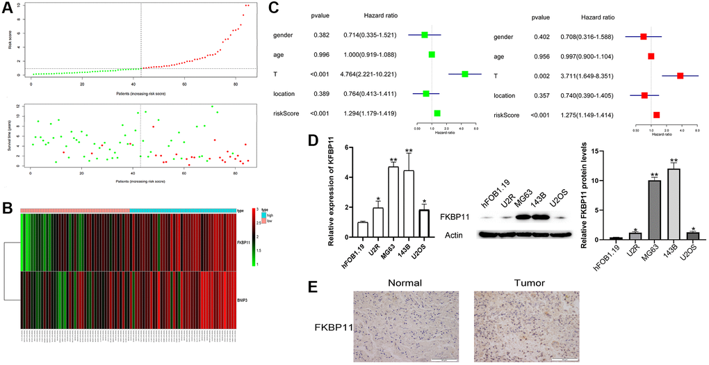 All patients’ risk scores were ranked from low to high by analyzing the sample risk score scatter plot and patient survival time graph. The higher the risk score was, the shorter the survival time (Figure 2A). The heatmap (Figure 2B) showed that the expression of FKBP11 and BNIP3 was significantly different in the high- and low-risk groups. Univariate and multivariate regression analyses of patient sex, patient age, tumor stage, tumor location, and risk score showed that tumor stage (P < 0.002) and risk score (P < 0.001) were significantly associated with the prognosis of patients with osteosarcoma (Figure 2C). We then chose FKBP11 for further functional study. To further analyze the expression of FKBP11 in osteosarcoma, we compared the expression of FKBP11 in HFOB1.19 cells and osteosarcoma cells by using qRT-PCR and western blotting. The results clearly showed that the mRNA and protein levels of FKBP11 were higher in osteosarcoma cells than in HFOB1.19 osteoblasts (Figure 2D). We further assessed the expression of FKBP11 in osteosarcoma tissues. The immunohistochemistry results showed that the expression of FKBP11 in osteosarcoma tissues was higher than that in para-cancerous tissues (Figure 2E).
