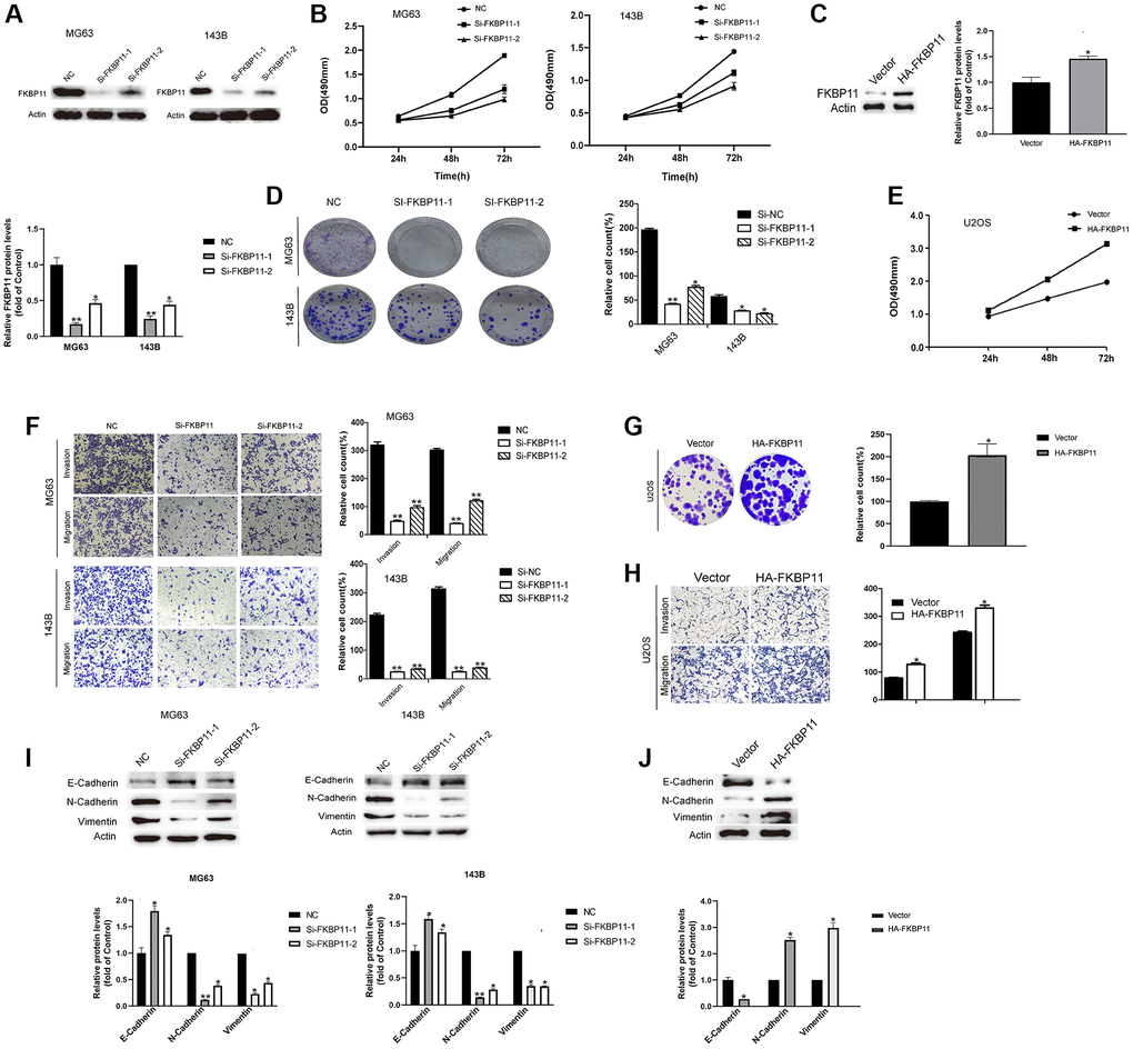 We examined the functional roles of FKBP11 in osteosarcoma. FKBP11 was knocked down by using siRNAs in MG63 and 143B cells, and knockdown was confirmed by western blotting (Figure 3A). Then, we assessed proliferation, invasion, migration, and colony formation in osteosarcoma cells upon FKBP11 silencing. After silencing FKBP11 in MG63 and 143B cells, the proliferation of osteosarcoma cells was significantly suppressed according to the results of the CCK-8 assay (Figure 3B). Colony formation was also suppressed after silencing FKBP11 (Figure 3D). In addition, when FKBP11 was silenced in MG63 and 143B cells, osteosarcoma cells had decreased migratory and invasive abilities (Figure 3F). Accordingly, silencing FKBP11 increased the protein level of the epithelial marker E-cadherin and reduced the protein levels of the mesenchymal markers N-cadherin and vimentin (Figure 3I). To explore whether the overexpression of FKBP11 might have the opposite effect to that of the knockdown of FKBP11. FKBP11 was overexpressed in U2OS cells (Figure 3C). As shown in Figure 3E, 3G, 3H, and 3J, overexpression of FKBP11 induced effects opposite to those induced by FKBP11 knockdown.