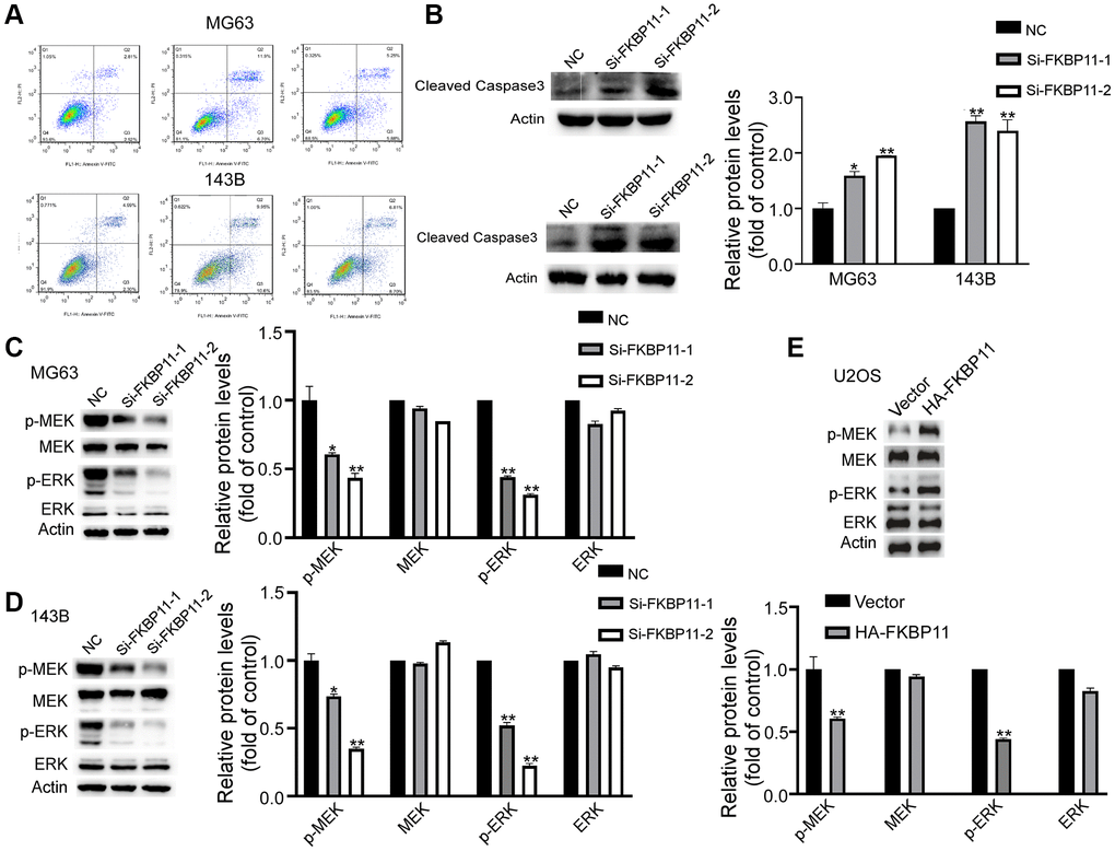 Next, we further examined the effect of FKBP11 in regulating osteosarcoma cell apoptosis. The results showed that after knocking down FKBP11, the apoptosis rate of cells was significantly increased compared with that of control cells (Figure 4A). Consistently, the expression of the apoptotic marker caspase 3 markedly increased (Figure 4B). It was reported previously that the FK506 binding protein-mediated MAPK pathway can alleviate prion-induced neurodegeneration [12]. The role of the MAPK pathway regulated by FKBP52 in polycystic ovary syndrome (PCOS) has also been reported [13]. We then explored whether FKBP11 plays a tumor-promoting role in osteosarcoma through the MAPK pathway. Compared si-NC (control) transfection, siFKBP11 transfection suppressed the phosphorylation of MEK/ERK (Figure 4C, 4D), while overexpression of FKBP11 promoted the phosphorylation of MEK/ERK (Figure 4E). These results suggest that FKBP11 may have an important impact on the progression of osteosarcoma via the MAPK signaling pathway.