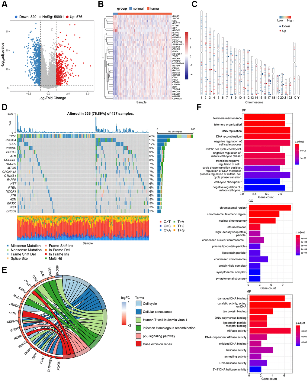 According to the Kyoto Encyclopedia of Genes and Genomes (KEGG) pathway analysis, these DEGs were mainly enriched in cell cycle regulation, homologous recombination, base excision repair, and P53 pathway (P < 0.05, Figure 1E). As expected, the 36 senescence-related DEGs were involved in DNA replication, telomere maintenance, negative cell cycle regulation, and DNA metabolism (P < 0.05, Figure 1F), which are consist in pathways related to cell cycle and cellular senescence. These findings collectively suggested the potential association between the senescence-related DEGs and the tumorigenesis of GC.