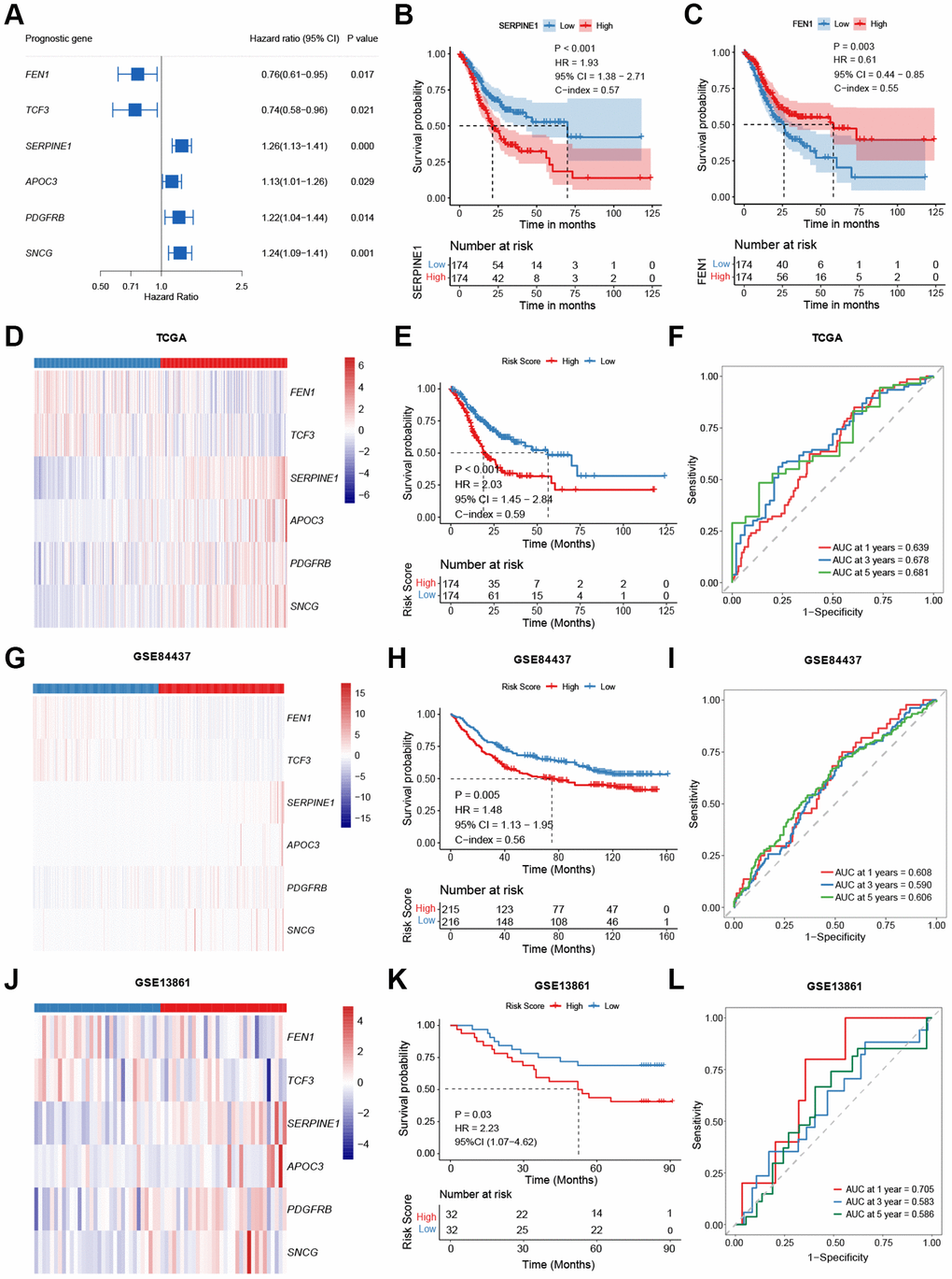 Based on the mRNA levels of these six genes, a risk-score was then developed and defined as follows: risk-score = (0.196 × SERPINE1) + (0.120 × APOC3) + (0.090 × SNCG) + (0.015 × PDGFRB) – (0.128 × TCF3) – (0.133 × FEN1). Assigned with a risk-score, patients were stratified into high- or low-risk groups by the median value in the cohort. Patients in the high-risk group had higher expression of SERPINE1, APOC3, PDGFRB, and SNCG and lower expression of FEN1 and TCF3 (P < 0.001, Figure 2D). In the TCGA-STAD cohort, the low-risk group exhibited improved OS (P < 0.001; HR = 2.03; 95% CI, 1.45–2.84; Figure 2E). The 1-, 3-, and 5-year area under curves (AUCs) of the risk-score were 0.639, 0.678, and 0.681, respectively (Figure 2F). These results were further verified in two validation cohorts (GSE84437 and GSE13861). Patients with higher risk had higher levels of SERPINE1, APOC3, PDGFRB, and SNCG, and lower FEN1 and TCF3 expressions (GSE84437: Figure 2G, GSE13861: Figure 2J, P < 0.01), together with worse OS (GSE84437: P = 0.005; HR = 1.48, 95% CI, 1.13–1.95; Figure 2H; GSE13861: P = 0.03; HR = 2.23, 95% CI, 1.07–4.62; Figure 2K). The signature predicted 1-, 3-, and 5-year OS with AUCs of 0.608, 0.590, and 0.606 in the GSE84437 cohort, and 0.705, 0.583 (Figure 2I), and 0.586 in the GSE13861 cohort (Figure 2L), respectively.