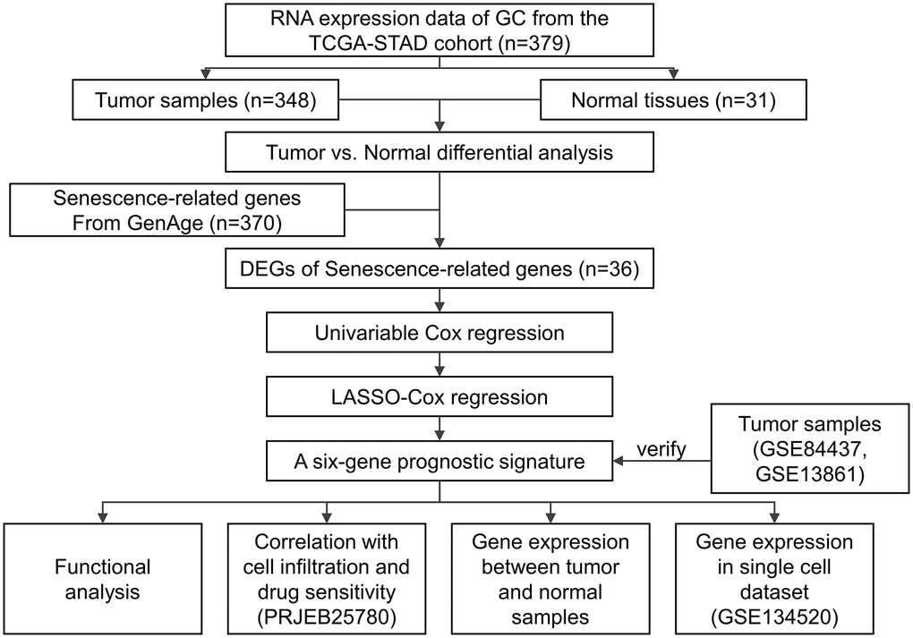 Gastric cancer is one of the most prevalent tumors, with the fifth-highest incidence and fourth-highest mortality rate all over the world [1]. Exploring prognostic and therapeutic biomarkers in GC is of great importance and urgency. Cancer is an aging disease and cellular senescence plays an essential role in promoting cancer development and tumor progression [2], suggesting the great potential of senescence-related genes in predicting prognosis and pharmacological response.