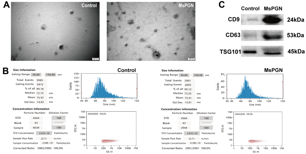 Exosomes from human urine are characterized by their morphology, diameter, concentration, and the presence of exosome-rich protein markers such as CD9, CD63, and TSG101. Transmission electron microscopy revealed exosomal bilayers of membranous structure and oval shape, with a typical cup-shaped structures, ranging in size from 30–100 nm. The results of particle size analysis of urinary exosomes in normal humans showed that the average particle size of urinary exosomes was 75.97 nm after 100-fold dilution, and a total of 5,985 particles were detected, with 99.78% of the particles being 30–150 nm and were at an average concentration of 2.64 × 1010 particles/mL. In patients with MsPGN, the mean particle size of urinary exosomes was 76.89 nm, and a total of 4,462 particles were detected, with 99.89% being 30–150-nm particles at a mean concentration of 3.93 × 1011 particles/mL. In addition, western blotting revealed that these exosomes were positive for CD9, CD63, and TSG101 proteins (Figure 1). CD9 and CD63 are exosome-enriched proteins of the tetraspanin family, whereas TSG101 is a protein essential for multivesicular body biogenesis.