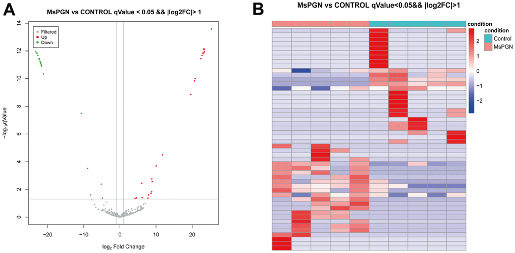 By comparing the TargetScan, miRDB, and miRWalk databases, 334, 445, and 279 miRNAs were found to be expressed in the normal control group, MsPGN patients, and co-expressed in both groups, respectively. The 50 significantly differentially expressed miRNAs (Table 2) were derived based on the log2 (fold change) absolute value ≥ 1, q-value < 0.05 screening criteria, among which 24 and 26 miRNAs were upregulated and downregulated, respectively (Figure 2A, 2B).