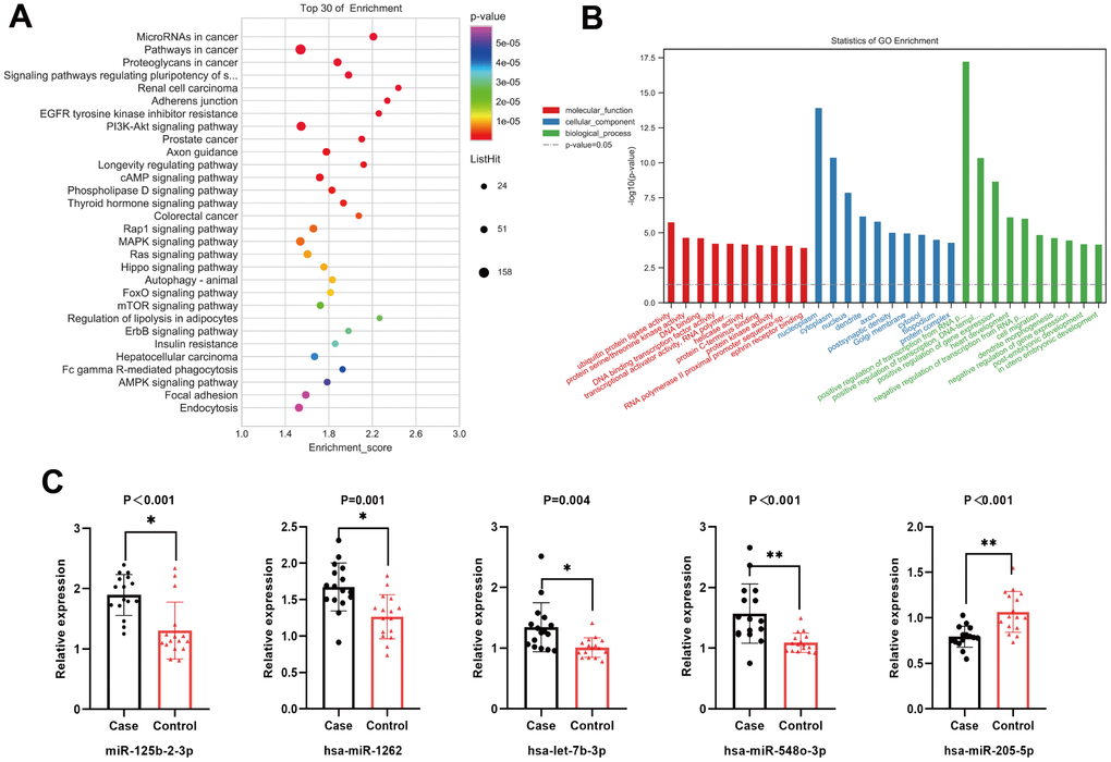 Based on RNA sequencing results and subsequent validation, we revealed that five miRNAs (miR-125b-2-3p, miR-1262, let-7b-3p, miR-548o-3p, and miR-205-5p) were differentially expressed between the two groups. The target genes of the five miRNAs were predicted using TargetScan, miRDB, and miRWalk databases. The main biological processes, molecular functions, and cellular components of the target genes of the five miRNAs were identified by GO analysis. A total of 246 meaningful GO functions were obtained, including 47 molecular functions (mainly ubiquitin-protein ligase, protein serine/threonine kinase, DNA-binding transcription factor, and protein kinase activities), 44 cellular components (mainly nucleoplasm, cytoplasm, and post-emphasis density), and 155 biological processes (mainly positive and negative regulation of RNA polymerase II promoter transcription, positive and negative regulation of gene expression, cell migration). The top 30 GO functions identified by GO annotation are shown in Figure 3B. To better understand the biological functions of the predicted target genes, KEGG analysis was performed to reveal the main pathways in which the candidate target genes might be involved. The top 20 significantly enriched pathways were identified, including the PI3K/Akt, MAPK, Rap1, and mTOR signaling pathways (Figure 3A), and classified into environmental information processing (six), molecular processes (three), organismal systems (four), and human diseases (seven).