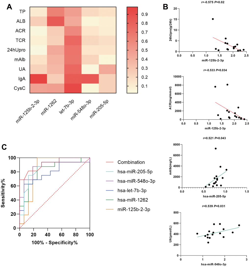 In addition, we performed a clinical analysis using Spearman correlation and simple linear regression analyses to elucidate the relationship between each differentially expressed miRNA and various MsPGN clinical features. According to our findings, both ACR and 24hUpro showed significant negative correlations with miR-125b-2-3p. Moreover, there was a positive correlation between uric acid levels and miR-548o-3p, and miR-205-5p was positively correlated with urinary microalbumin. Since miRNA expression correlated with different clinical features of MsPGN, we combined these five miRNAs in ROC analysis with an area under the curve of 0.916, suggesting high diagnostic efficacy.