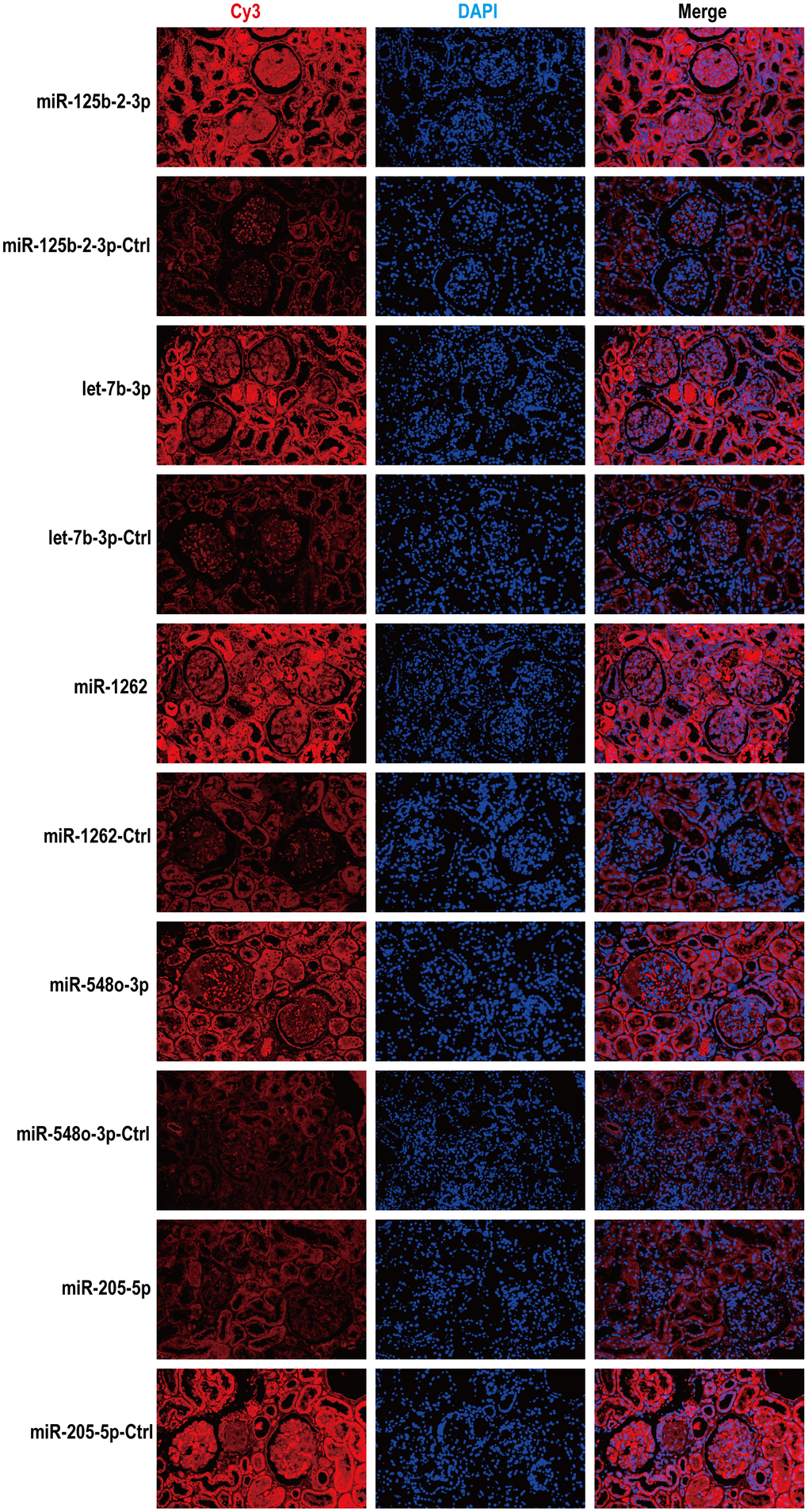 The expression levels and localization of 5 miRNAs in renal tissues were detected by fluorescence in situ hybridization (FISH). Five probes for Cy3-labeled miRNAs were designed (hsa-miR-125b-2-3p, 5'-GTCCCAAGAGCC+TGACT+TGTGA-3'; hsa-miR-1262, 5'-ATCCT+ TCTACAAAT+TCACCCAT-3'; hsa-let-7b-3p, 5'-GGGAAGGCAG+TAGGT+TGTATAG-3'; hsa-miR-548o-3p, 5'-GCAAAAGTAAC+TGCAGT+TTTGG-3'; hsa-miR-205-5p, 5'-CAGAC+TCCGG+TGGAATGAAGGA-3', purchased from GenePharma (Shanghai, China). Each probe was hybridized overnight according to the manufacturer's instructions.