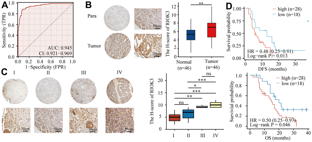 In our previous study, bioinformatics analysis of PDAC transcriptome data derived from The Cancer Genome Atlas (TCGA) and the Genotype-Tissue Expression (GTEx) database revealed that RIOK3 mRNA was significantly overexpressed in PDAC tissues [20]. In this study, we used these data to perform Receiver operating characteristic (ROC) analysis and showed that RIOK3 mRNA expression had a good predictive ability to distinguish PDAC tissues from normal pancreatic tissues. The area under curve (AUC) was 0.945 (95% confidence interval [CI] = 0.921-0.969) (Figure 1A). To further clarify the protein expression of RIOK3 in PDAC tissues, we performed immunohistochemical (IHC) analysis on a tissue microarray containing 46 pairs of PDAC and adjacent normal tissues and found that the protein expression (H-score) of RIOK3 in PDAC tissues was significantly higher than that in adjacent normal tissues (Figure 1B). 46 PDAC patients‘ baseline characteristics were listed in Table 1. Interestingly, similar to previous findings, the protein expression of RIOK3 was abnormally upregulated as the pathological stage increased (Figure 1C). Furthermore, patients with high RIOK3 expression had a significantly shorter overall survival (OS) (20.0 vs. 15.0 months, HR = 0.50, 95% CI 0.25-0.97, p = 0.046) and disease-free survival (DFS) (13.0 vs. 6.0 months, HR = 0.48, 95% CI 0.25-0.91, p = 0.013) than those with low expression (Figure 1D). Overall, our study found that the RIOK3 protein was significantly overexpressed in PDAC tissues and was associated with a poor prognosis.