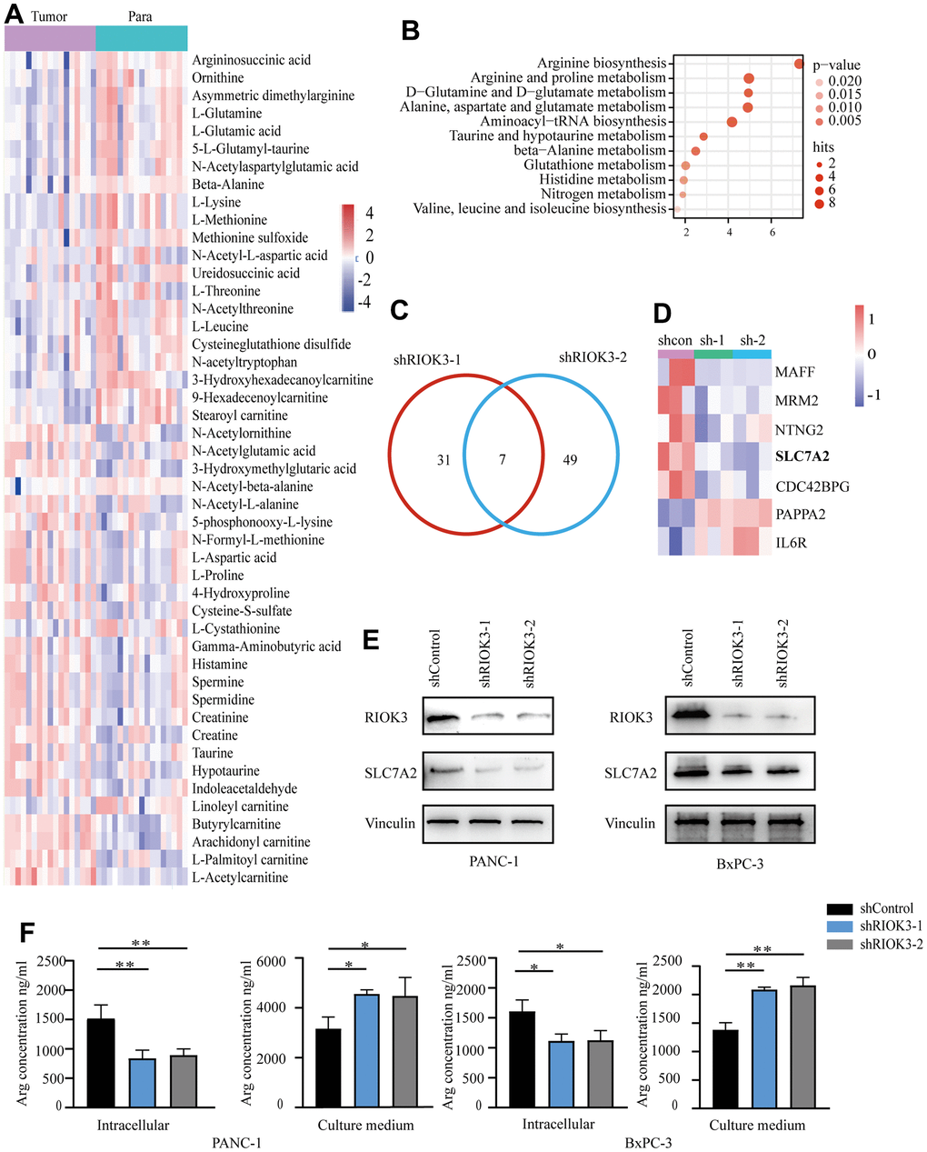 Abnormal arginine metabolism is one of the characteristics of metabolic reprogramming in PDAC [12]. Subsequently, we selected 27 pairs of PDAC and adjacent normal fresh tissues in the above microarray sample set for metabolomic analysis. The results showed that, compared with the paired adjacent normal tissues, there were 47 different metabolites in PDAC tissues with high RIOK3 expression (n=17) (Figure 2A), and pathway enrichment analysis suggested that these differential metabolites were associated with arginine synthesis and arginine and proline metabolism (Figure 2B), whereas only 28 differential metabolites were found in cancer tissues with low RIOK3 expression (n=10) (Supplementary Figure 1A), and the pathway enrichment analysis did not reveal any pathway associated with arginine metabolism (Supplementary Figure 1B). To further clarify whether the aberrant expression of RIOK3 is associated with arginine metabolism, we constructed PANC-1cell lines with stable knockdown of RIOK3 (shRIOK3-1 and shRIOK3-2) and performed metabolomic analysis. We found 33 different metabolites in 2 different RIOK3 knockdown cell lines (Supplementary Figure 1C). Pathway enrichment analysis showed that these different metabolites were linked to arginine biosynthesis and arginine and proline metabolism (Supplementary Figure 1D). Overall, we found that RIOK3 was associated with arginine metabolism in PDAC.