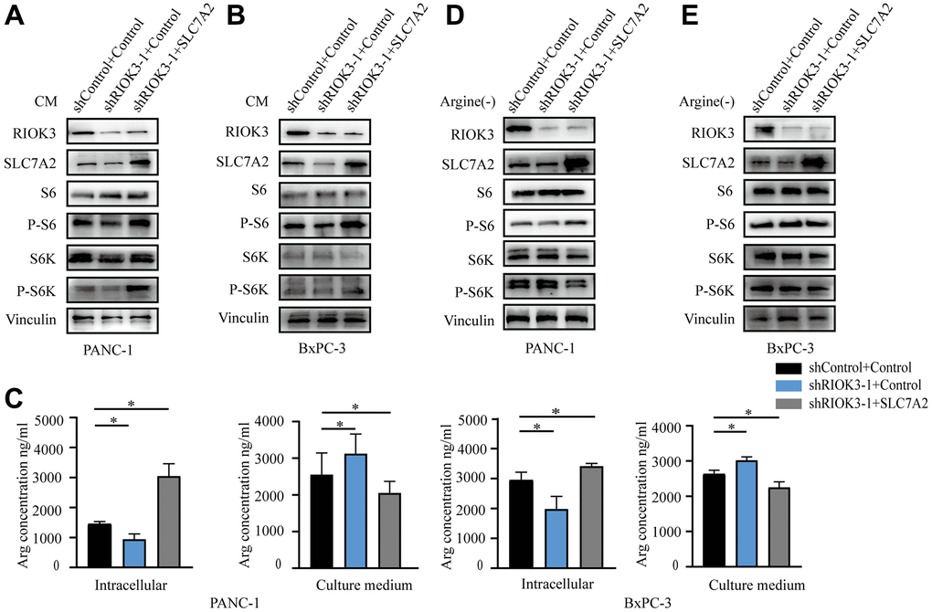 To further explore the specific mechanism of RIOK3 regulation of arginine metabolism, we performed high-throughput transcriptome analysis on the above cell lines. Following RIOK3 knockdown, 7 genes were significantly altered in the two independent RIOK3 knockdown cell lines (Figure 2C). Among them, the arginine transporter protein SLC7A2 was significantly downregulated with RIOK3 knockdown (Figure 2D). SLC7A2 is an inducible transporter of the semi-essential amino acid arginine, which is one of the main carriers for the transport of arginine from the extracellular environment. Subsequent western blot analysis also confirmed that, with the knockdown of RIOK3, the protein of SLC7A2 was similarly significantly downregulated in both PANC-1 and BxPC-3 cell lines (Figure 2E). Based on the results of metabolomic and transcriptomic analyses, we hypothesized that RIOK3 could increase arginine uptake mediated by SLC7A2. Subsequently, we quantified the arginine content in both the culture medium and the cells, and found that when RIOK3 was knockdown, the arginine content significantly reduced in cells, and increased in the cell culture medium (Figure 2F). Overall, our results revealed that RIOK3 was significantly associated with arginine metabolism in PDAC and that RIOK3 may promote arginine uptake through upregulation of SLC7A2 expression.