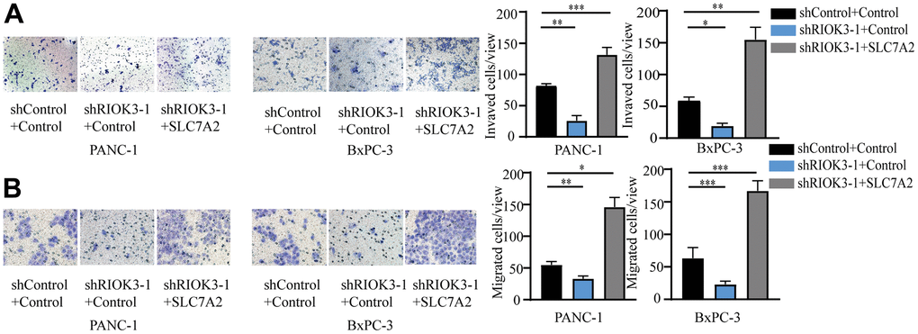 Our previous study confirmed that RIOK3 plays an important role in the invasive metastasis of PDAC. To further clarify whether SLC7A2 is involved in this process, we performed invasive and metastasis assays using the above cell lines. We found that RIOK3 knockdown significantly inhibited the invasion and metastasis of PDAC cells, and the reintroduction of SLC7A2 was indeed able to compensate for the reduced invasion and metastasis caused by RIOK3 knockdown (Figure 4A, 4B). Overall, SLC7A2 plays a key role in RIOK3-mediated invasion and metastasis of PDAC cells.