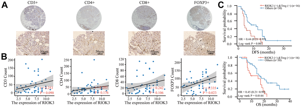 The content of arginine in the PDAC microenvironment is closely related to infiltrating lymphocytes [24]. We subsequently explored the correlation between RIOK3 and infiltrating lymphocytes in PDAC tissues. First, 46 PDAC tissues were stained with IHC for CD3, CD4, CD8, and FOXP3 and counted. Subsequent correlation analysis showed that RIOK3 was positively correlated with Treg cells (r=0.335, P=0.023), while there was no significant correlation with CD3+, CD4+, and CD8+ T cells (Figure 5A, 5B). In addition, we found that RIOK3 high combined with Treg high patients had significantly shorter DFS (12.0 vs. 4.2 months, HR=0.44, 95% CI 0.21-0.95, p=0.007) and OS (17.5 vs. 15.5 months, HR=0.45, 95% CI 0.21-0.99, p=0.0144) (Figure 5C) than other patients. These results suggest that high expression of RIOK3 and Treg infiltration are significantly associated with poor prognosis in PDAC patients.