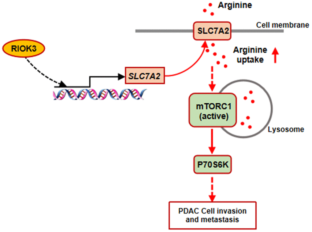 In this study, we identified that SLC7A2-mediated acceleration of arginine uptake is a key process by which RIOK3 promotes mTORC1 activation in PDAC cells (Figure 6). In addition, we found that High RIOK3 expression combined with Treg infiltration was significantly associated with poor prognosis in PDAC patients.