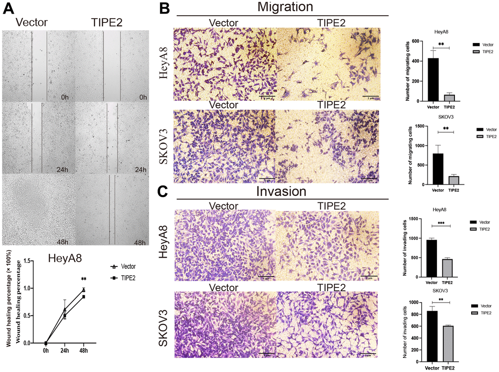Metastasis is an important feature of cancer. To excavate the potential feature of TIPE2 in EOC mobility, the wound healing assay was performed in HeyA8 cells using Culture-Inserts for Live Cell Analysis (Ibidi, Martinsried, Germany), and cells migrating into the gap were tracked within 48h. By 24 hours, the wounds were apparent and the rate at which TIPE2 overexpressing cells migrated toward the wound was almost the same as that of the vector group. By 48 hours, however, the incision of the HeyA8/Vector group was nearly completely healed (Figure 4A). As expected, the wound healing assay uncovered that upregulation of TIPE2 significantly inhibited the migratory ability of EOC cells. Transwell assay was employed to further investigate the effect of TIPE2 on EOC cell migratory and invasive capacities in vitro. Consistently, the metastatic ability of HeyA8 and SKOV3 cells were all obviously suppressed after TIPE2 overexpression (Figure 4B, 4C). These findings imply that TIPE2 reduces the migration and invasion ability of EOC cells in vitro.