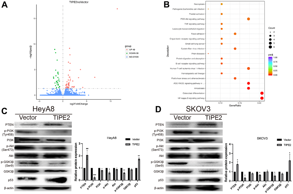 To further elucidate the molecular mechanism by which TIPE2 suppresses the malignancy of EOC cells, the RNA-seq based transcriptome analysis was conducted in TIPE2 overexpressing SKOV3 cells and control cells. The differentially expressed genes (DEGs) volcano plots are represented in Figure 5A. There were 49 upregulated and 28 downregulated genes in the SKOV3/TIPE2 group compared to the vector group, as determined by |log2Foldchange| > 0 and p < 0.05. The biological functions of DEGs were then determined using the Kyoto Encyclopedia of Genes and Genomes (KEGG), which indicated that the biological processes were enriched in the NF-kappa B signaling system, osteoclast differentiation, amoebiasis, and other pathways (Figure 5B). Notably, the PI3K/Akt signaling pathway, a well-known activated intracellular signaling pathway in various human malignancies, was suppressed by TIPE2 overexpression. Western blot analysis was carried out to determine the expression levels of PI3K/Akt signaling pathway-related proteins. The results showed that overexpression of TIPE2 reduced the phosphorylation levels of PI3K, Akt, and the downstream effector molecule GSK3β in HeyA8 and SKOV3 cell lines, whereas the total protein level did not change appreciably (Figure 5C, 5D). Overexpression of TIPE2 also increased the PTEN levels in EOC cell lines, which is a negative regulator of the PI3K/Akt signaling pathway, and its suppression would lead to constitutive activation of Akt [36, 37]. These findings imply that TIPE2 may exert its anti-tumor effect by inhibiting the PI3K/Akt signaling pathway. P53 inhibition is a crucial event in tumor development [38]. Western blot analysis revealed that overexpression of TIPE2 also increased the expression of p53 in HeyA8 and SKOV3 cell lines (Figure 5C, 5D).