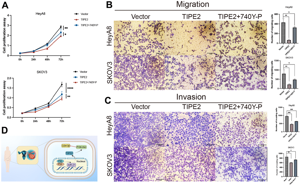 The relationship between TIPE2 and the PI3K/Akt signaling pathway was further investigated by treating TIPE2 transfected HeyA8 and SKOV3 cells with 740Y-P, a nonspecific agonist of PI3K [39]. TIPE2 overexpression-induced proliferation suppression of HeyA8 and SKOV3 cells was partially restored by pretreatment with 740Y-P, as shown in Figure 6A. Furthermore, co-treatment with 740Y-P dramatically reversed TIPE2-induced suppression of EOC cell migration and invasion (Figure 6B, 6C). The schematic diagram of the anti-tumor activity of TIPE2 in human EOC is shown in Figure 6D [40].