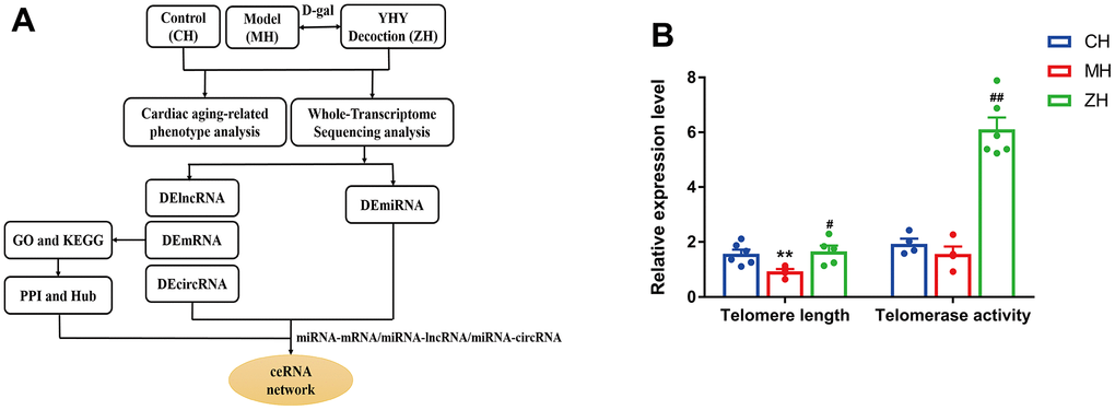Thus, the purpose of the current study is to verify the efficacy of YHY decoction against cardiac aging in D-gal-induced mouse model, and explore the potential mechanisms of YHY decoction treatment through whole-transcriptome sequencing technique. These results could provide novel insights into the molecular basis of YHY decoction in treating cardiac aging.