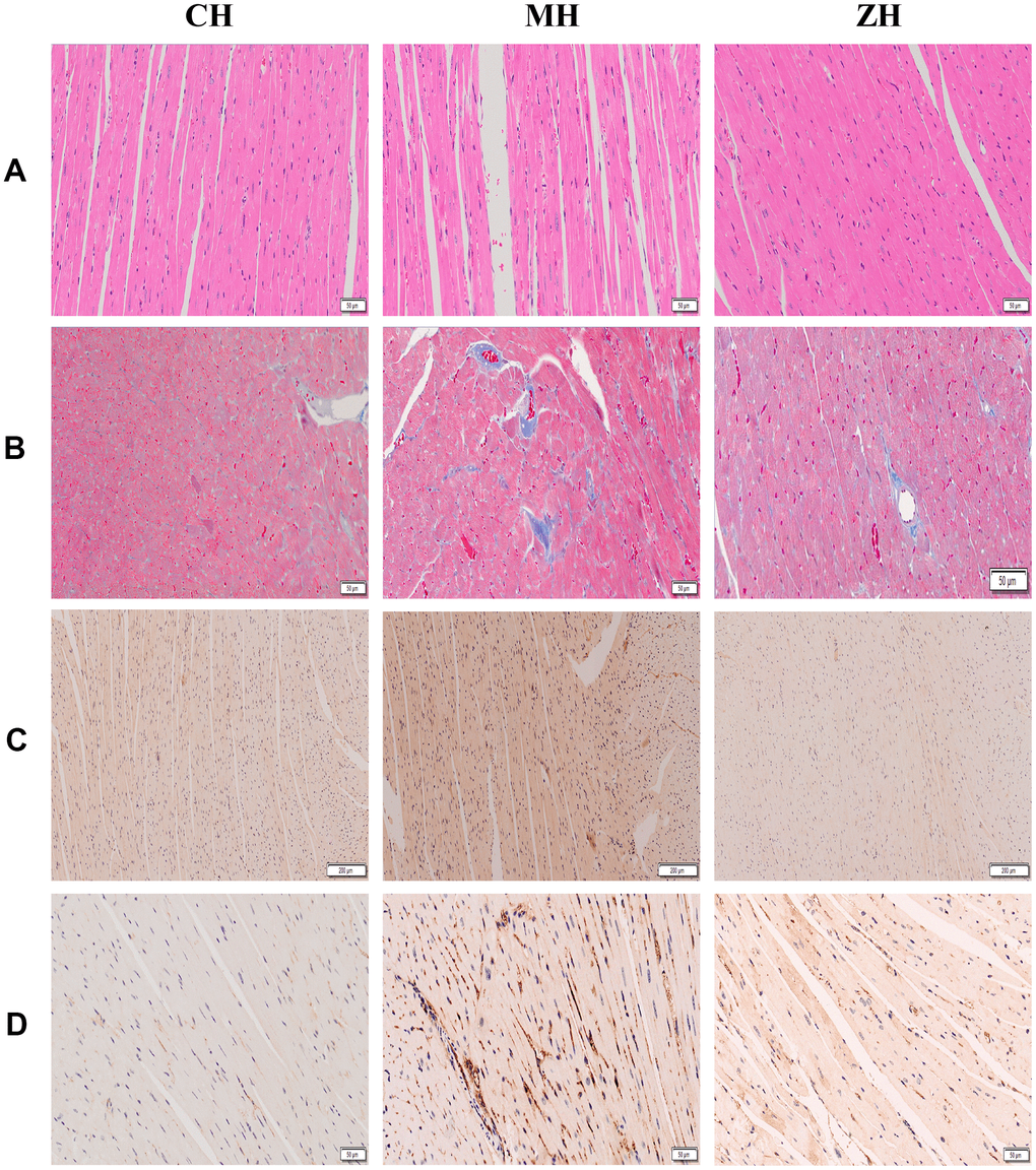 Heart tissue was fixed with 4% paraformaldehyde for 24 h, dehydrated, embedded in paraffin, and sectioned (4 μm), followed by Histochemical (HE) and Masson staining. For HE staining, the tissue slices were dewaxed with xylene I and xylene II, followed by dibenzene stepwise with descending gradient ethanol and rinsed with tap water. After nuclear staining, washing, differentiation and other experimental procedures, the slices were dehydrated, transparent, and mounted. For Masson staining, the dewaxed slices were placed in Masson mixture (Masson A and B=1:1) for 10 min, followed by 1% hydrochloric acid alcohol. The slices were treated by ponceau, phosphomolybdic acid, aniline blue and sealed with 1% glacial acetic acid. Finally, tissue sections were observed using an optical microscope (Olympus, Japan).
