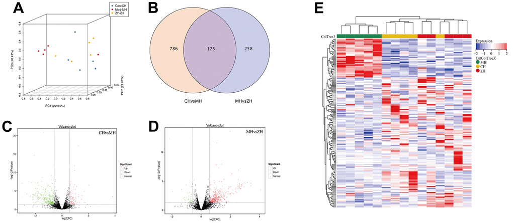 PCA analysis was performed on the mRNA expression levels of the three groups, and the results showed that the control group and the YHY decoction group had a clustering trend, which was significantly separated from the model group. According to the screening criteria, there are 961 differentially expressed mRNAs were identified between control group and model group, and there are 433 differentially mRNAs were identified between YHY decoction group and model group. The intersection of the three group has a total of 175 differential genes. The two-way clustering heatmap was showed in Figure 4E, from which we found YHY decoction treatment samples can be significantly separated from aging model group samples, indicating that the results of the differential expression analysis were reliable.