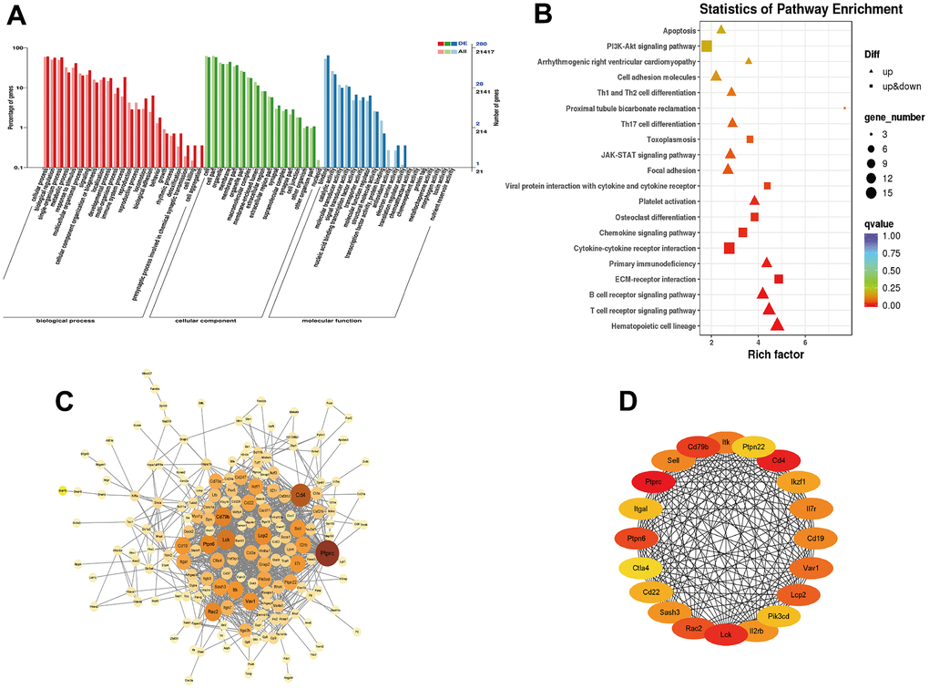To investigate the molecule mechanisms underlying the effect of YHY decoction against D-gal-induced cardiac aging, we subjected the differential expressed genes to GO and KEGG pathway analysis. GO pathway analysis showed that the differential genes mainly enriched in biological regulation, metabolic process, immune system process, membrane part, extracellular region part, et al. KEGG pathway analysis showed that differential genes were associated with Hematopoietic cell lineage, immune system (T and B cell receptor signaling pathway, primary immunodeficiency, Th17 cell differentiation, Th1 and Th2 signaling pathway), ECM-receptor interaction, platelet activation, cytokine-cytokine receptor interaction, cell adhesion molecules, JAK-STAT signaling pathway and PI3K-Akt signaling pathway, et al. (Figure 5A, 5B). The STRING online database was applied to construct the PPI network (Figure 5C), and analysis of hub genes was achieved by the degree method in cytoHubba (Figure 5D).