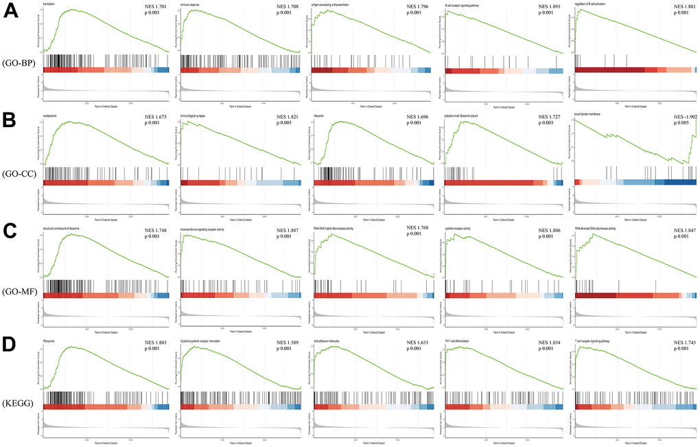 Considering that GO and KEGG Pathway analysis often focus on genes that are differentially expressed between two groups, it is easy to miss some genes that are not significantly differentially expressed but have important biological significance. Therefore, we employed GSEA analysis on the raw expression matrix of mRNAs. Translation, immune response (T and B cell receptor signaling pathway, Th17 cell differentiation), ribosome, cytokine-cytokine receptor interaction, cell adhesion molecules were the most significant enriched pathway (Figure 6).
