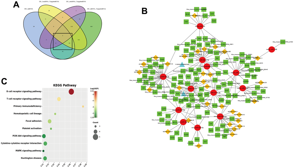 The ceRNA hypothesis believes that endogenous RNA molecules can competitively bind to miRNAs, thereby indirectly regulating the expression of miRNA target genes. To obtain the competing relationships, we predicted the interacting between DEG mRNA-DEG miRNA, DEG lncRNA-DEG miRNA and DEG circRNA-DEG miRNA (Figure 8A). According to co-expression networks, we found that 13 DEG miRNA (miR-324-3p, miR-770-3p, miR-666-5p, miR-12191- 3p, miR-150-5p, miR-205-5p, miR-3097-5p, miR-365-2-5p, miR-7685-5p, novel miR-14, novel miR-298, novel miR-384 and novel miR-86) were core targets of the ceRNA network which could connected with 31 DEG lncRNA and 2 DEG circRNA. Furthermore, the 13 DEG miRNA could target 117 DEG mRNA (Figure 8B). The lncRNA/circRNA-miRNA-mRNA complex network was constructed by Cytoscape. KEGG pathway analysis showed that co-expressed mRNA in ceRNA network were associated with immune system (T and B cell receptor signaling pathway and primary immunodeficiency), Hematopoietic cell lineage, Focal adhesion, Platelet activation, PI3K-Akt signaling pathway, Cytokine-cytokine receptor interaction and MAPK signaling pathway (Figure 8C).