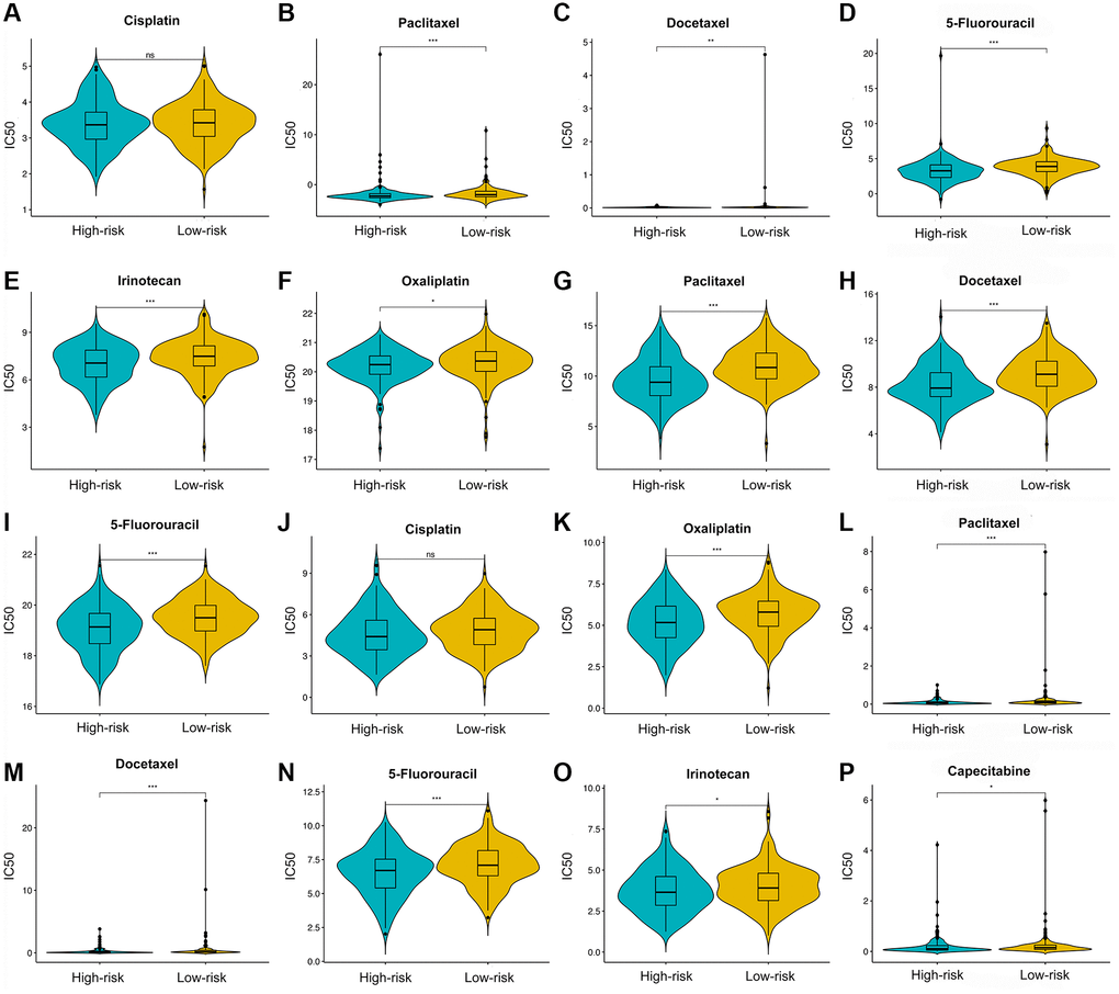 Based on the three public drug sensitivity databases, CGP (Cancer Genome Project), GDSC (Genomics of Drug Sensitivity in Cancer), and CTRP (Cancer Therapeutics Response Portal), the ridge regression models were built by the pRRophetic algorithm to predict chemotherapeutic responses. Gene expression profiling and risk grouping information were used in the model to estimate the half-maximal inhibitory concentrations (IC50) for each sample [21]. The prediction accuracy was evaluated by 10-fold cross-validation based on each training set. The smaller the IC50 value of the drug, the stronger its ability to inhibit cell growth and the better the effect of cancer treatment. Here, common GC therapeutic drugs, such as cisplatin, oxaliplatin, docetaxel, paclitaxel, 5-fluorouracil (5-Fu), capecitabine, and irinotecan were selected for analysis.