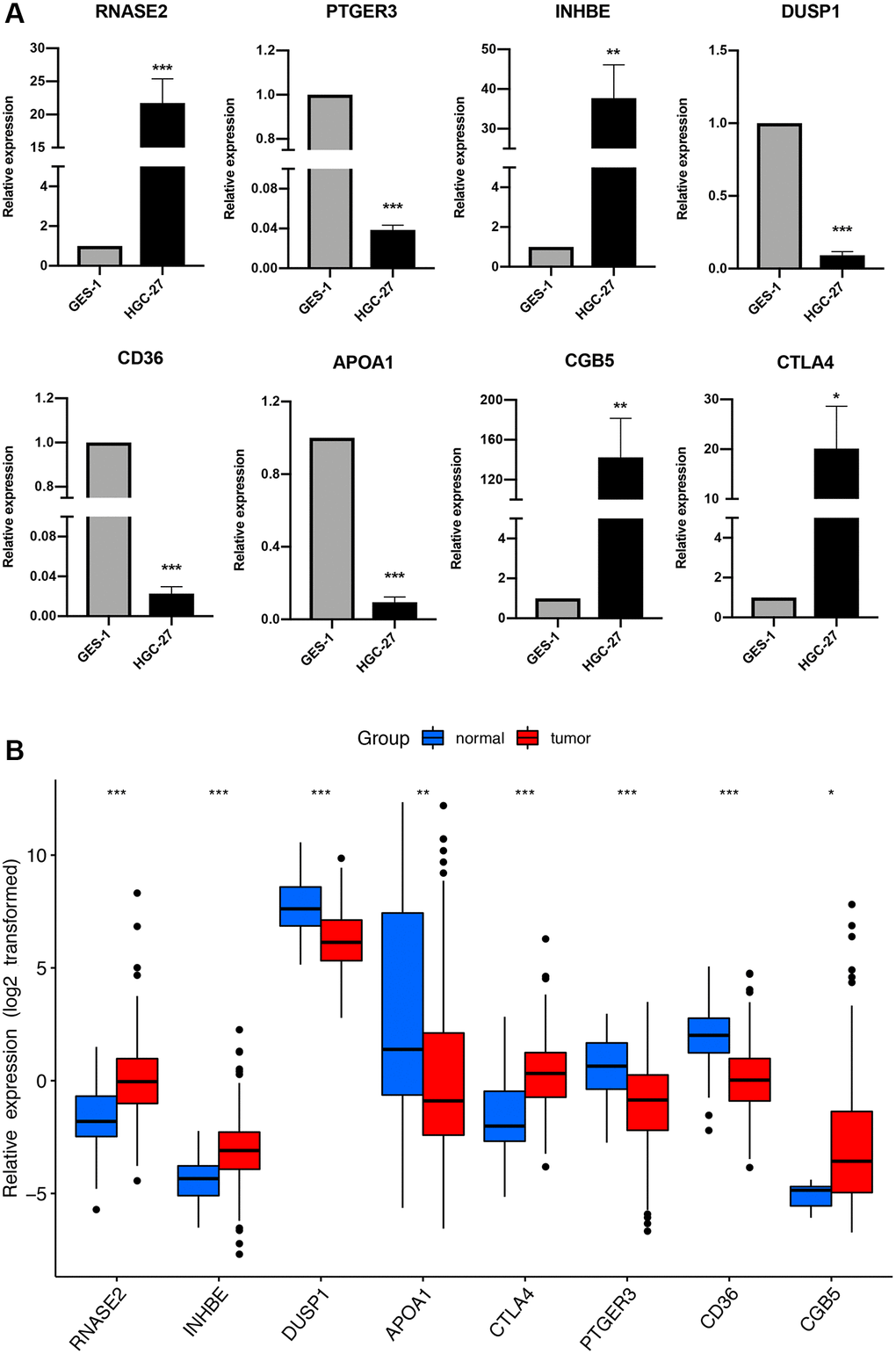 Previously immune-related gene signatures were mostly established based on the differentially expressed gene sets. Here, we applied the WGCNA analysis to further filter candidate gene markers, which increases the reliability of the final result. After conducting the Cox regression analysis, a final prognostic signature consisting of 8 genes (RNASE2, CGB5, INHBE, PTGER3, CTLA4, DUSP1, APOA1, and CD36) was constructed. Of these genes, some had previously been reported to play vital roles in cancer. CD36, a multi-ligand scavenger receptor expressed on the surface of platelets, adipocytes, hepatocytes, and epithelial cells, was reported to be associated with adverse prognosis and treatment resistance of patients with GC and other solid tumors [23–27]. Additionally, evidence indicated that CD36 can promote GC cell migration and invasion by inducing c-Myc-dependent DEK transcription, GSK-3β/β-catenin pathway activation, and EMT, suggesting that CD36 may serve as a novel target in GC [23]. CTLA4 is one of the most studied immune checkpoints in malignancies, blockade of which has yielded considerable clinical benefits for patients with malignant tumors [28]. Studies showed that CTLA4 mRNA levels are upregulated in tumor tissues and correlate with a favorable prognosis [29]. DUSP1 participates in several cellular processes including proliferation, differentiation, and apoptosis. Interestingly, strong expression of DUSP1 is a favorable prognostic factor in glioma and hepatocellular carcinoma [30, 31]. However, it was also reported to be upregulated in several solid tumors where it facilitated carcinogenesis [32–34], suggesting that the role of DUSP1 in carcinogenesis could be controversial in different tumors. CGB5 was reported to be associated with poor prognosis in GC in several bioinformatics studies [35, 36]. Another study suggested that it may promote tumor growth and vascular formation in ovarian cancer via activation of the LHR signal transduction pathway [37]. Previous studies have reported that PTGER3 is mainly involved in the carcinogenesis of gynecological malignancies [38]. It was found to act as an independent prognostic factor and was associated with poor overall survival in cervical and ovarian cancers [39, 40]. PTGER3 promotes the tumor cell migration by regulating uPAR expression to affect cervical cancer progression [41]. APOA1, a major protein moiety in high-density lipoprotein (HDL) particles, may suppress colorectal tumor progression via regulating the metabolism of intracellular cholesterol [42]. It was found in high amounts in urine from patients with bladder cancer, and utilizing exfoliative urinary cytology in combination with APOA1 detection increased the sensitivity of diagnosis [43, 44]. Also, studies suggested that APOA1 might act as an innovative marker in predicting recurrence, development, prognosis, and chemotherapy resistance of some solid tumors [45–47]. There is less data on INHBE and RNASE2 in malignancies, except for some bioinformatics studies reporting their predictive value in cancer prognosis, indicating that more in-depth studies on their biological functions are necessary in the future.
