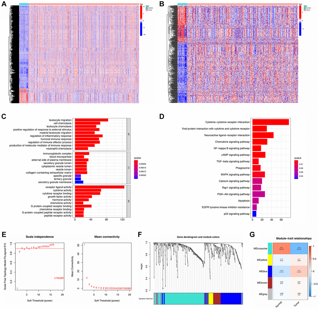 WGCNA is a method for exploring gene expression patterns of multiple samples [12]. Genes with similar expression patterns can be clustered, and the relationship between modules and specific traits or phenotypes can be analyzed. Firstly, Pearson’s correlation matrix was defined based on the interaction coefficients among genes. An adjacency matrix was defined with the threshold of Pearson coefficient exceeding 0.8, which was further used to construct a topological overlap matrix (TOM). Finally, the TOM matrix was applied for determining the co-expression gene modules, in this process modules with statistical significance (P < 0.05) were regarded as cancer-related modules, and genes involved in the modules were considered more important and used for subsequent analysis.