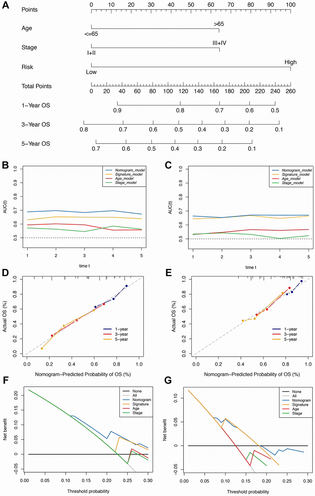 A nomogram is a statistical predictive tool that combines multiple prognostic factors to assess the survival probability for individual patients. To investigate whether the IRG prognostic signature possesses independent predictive capacity. First, risk scores together with clinical parameters including age, gender, tumor grade, and pathological stage were investigated by univariate Cox regression analysis to filter prognostic factors in the TCGA cohort. The above variables with P < 0.05 were then selected for inclusion in multivariate Cox regression analysis to determine independent prognostic ability. A combined prognostic model consisting of factors with P < 0.05 in multivariate Cox regression analysis was compared with the clinical model or IRS model respectively with regard to time-dependent AUC value and calibration curve. Finally, the model was visualized by nomogram and assessed by DCA to detect whether using this nomogram could yield closer associations with clinical net-benefit than other models.