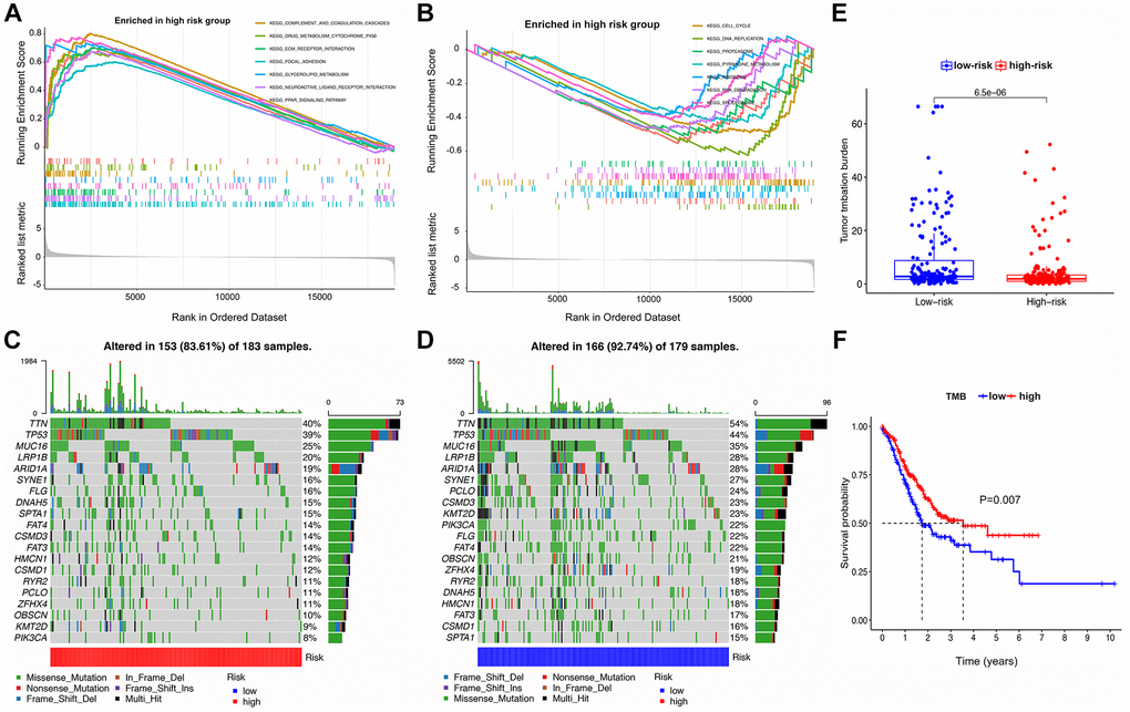 Summaries of gene mutation profiles for the different risk groups are shown in the Supplementary Figures 1 and 2, suggesting that the LRG has a higher overall mutation frequency than the HRG. Nonetheless, the top six genes with the highest mutation rates in the LRG were TTN (54%), TP53 (44%), MUC16 (35%), LRP1B (28%), ARID1A (28%), and SYNE1 (27%), which is similar to the HRG with TTN (40%), TP53 (39%), MUC16 (25%), LRP1B (20%), ARID1A (19%), and SYNE1 (16%). The most common mutation type was missense mutation in both LRG and HRG (Figure 5C, 5D).