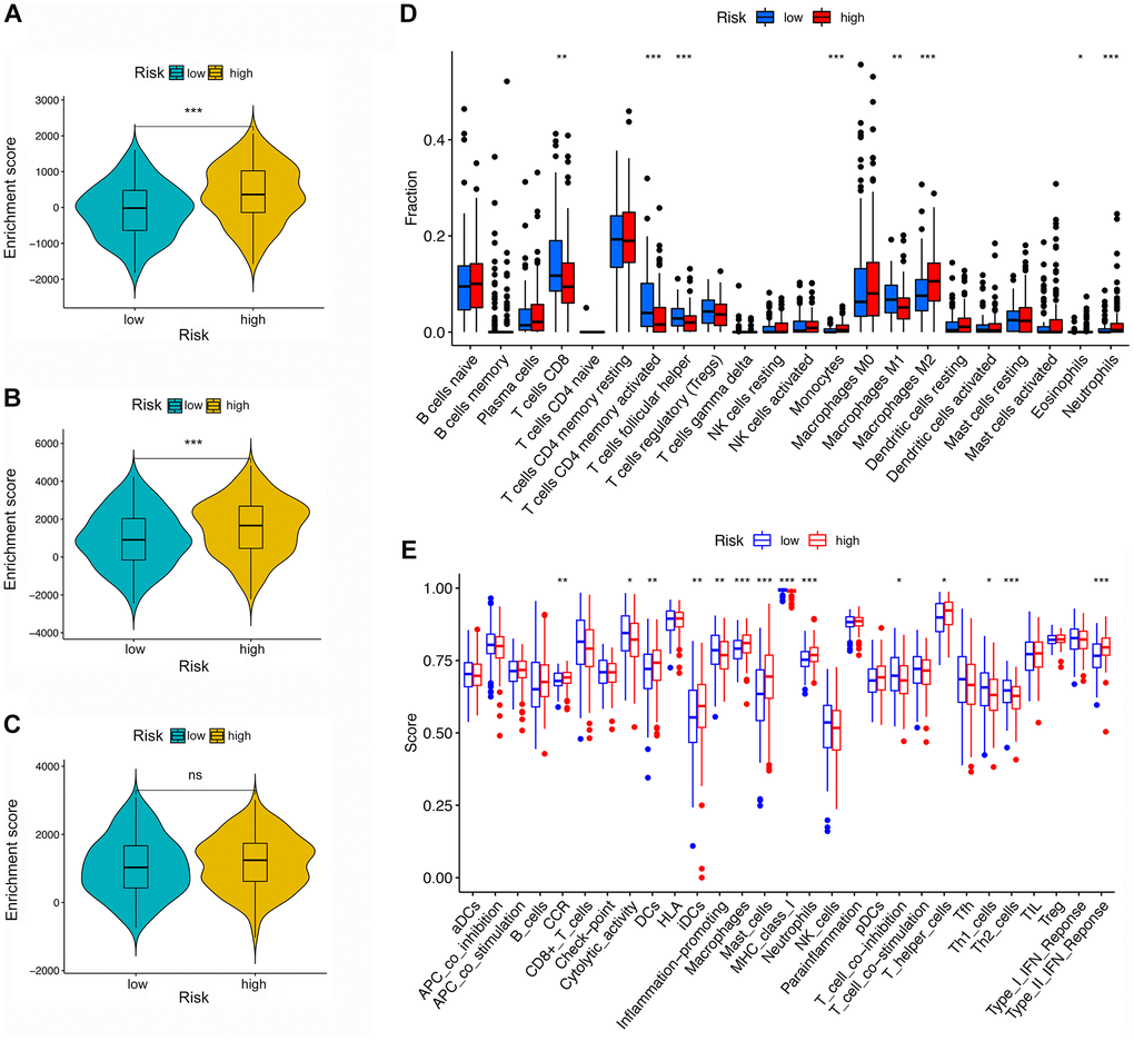 First, the difference between the TME and immune cell infiltration was analyzed for LRG and HRG. As shown in Figure 6A–6C, the stromal score and ESTIMATE score were both higher in HRG than LRG, whereas the immune score was not significantly different, indicating that the HRG had a higher proportion of stromal cells than LRG while tumor purity was lower.