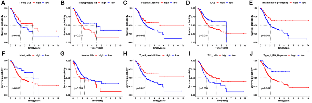 Second, by using the CIBERSORT, the abundance of immune cells in each GC sample was estimated and can be seen intuitively in the histogram (Supplementary Figure 3). The number of samples with significant levels of immune cell infiltration in the HRG was greater than in the LRG. Score difference analysis for immune cells’ abundance in different risk groups showed that compared with the HRG, the LRG had higher abundances of CD8+ T cells (P < 0.01**), CD4+ activated memory T cells (P < 0.001***), follicular T helper cells (P < 0.001***), and M1 macrophages (P < 0.01**). On the other hand, there was a lower abundance of monocytes (P < 0.001***), M2 macrophages (P < 0.001***), eosinophils (P < 0.05*), and neutrophils (P < 0.001***) (Figure 6D). Notably, the results of XCELL, TIMER, EPIC, and QUANTISEQ showed good consistency with the CIBERSORT (Supplementary Figure 4). Score differences for immune-related functional pathways suggested that the scores for cytolytic activity (P < 0.05*), inflammation promoting (P < 0.01**), MHC class I (P < 0.001***), T cell co-inhibition (P < 0.05*), Th1 cells (P < 0.05*), and Th2 cells (P < 0.001***) were higher in LRG than in HRG. In contrast, the scores for CCR (P < 0.01**), DCs (P < 0.01**), iDCs (P < 0.01**), macrophages (P < 0.001***), mast cells (P < 0.001***), neutrophils (P < 0.001***), T helper cells (P < 0.05*), and type II IFN responses (P < 0.001***) were lower in the LRG than in the HRG (Figure 6E). Moreover, survival analysis based on immune cells’ abundance in all samples implied that high infiltration of CD8+ T cells was connected with a favorable prognosis and that high abundance of M2 macrophage was related to an adverse prognosis (Figure 7A, 7B). This confirms that specific immune infiltration patterns have impact on patient prognosis. Survival analysis for immune-associated pathways suggested that high enrichment scores for cytolytic activity, inflammation promoting, T cell co-inhibition, and Th2 cell presence were associated with a favorable prognosis, whereas IDCs, mast cells, neutrophils, and type II IFN responses were associated with adverse prognosis (Figure 7C–7J).