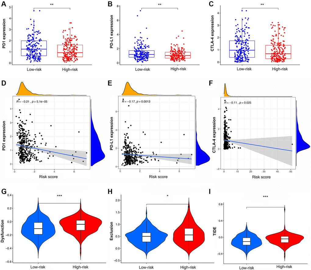 Analysis of immune checkpoints showed that PD-1, PD-L1, and CTLA4 were more highly expressed in LRG than in HRG, with decreasing expression as the risk score increased (Figure 8A–8F). The results of cytokine suggested that IFN-γ, IL-21, and OSM had higher expression in LRG than in HRG while IL-1α, IL-1β, IL-10, IL-24, TGF-β, EGF, and VEGF had lower expression in LRG than in HRG (Supplementary Figure 6A–6J). The analysis of chemokine showed that CCL2, CCL7, and CXCL8 were highly expressed in the HRG than in the LRG whereas the CXCL9, CXCL10, and CXCL11 were highly expressed in the LRG than in the HRG (Supplementary Figure 6K–6P).