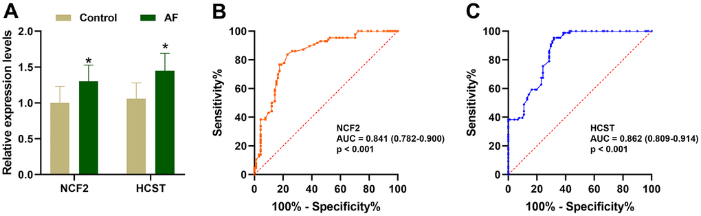 As shown in Figure 9A, compared with the SR subjects, the expression levels of neutrophil cytosolic factor 2 (NCF2), lysosomal protein transmembrane 5 (LAPTM5), hematopoietic cell signal transducer (HCST), hematopoietic cell-specific lyn substrate 1 (HCLS1), C-X-C motif chemokine ligand 12 (CXCL12), coronin 1A (CORO1A), complement C1q C chain (C1QC) and junction adhesion molecule like (AMICA1) were significantly increased in AF patients. Meanwhile, compared with the m6A cluster-A group, the expression of NCF2 and HCST was significantly increased in the m6A cluster-B and -C groups (Figure 9B). Since the NCF2 and HCST genes differ between SR subjects and AF patients and among different m6A-modified molecular subtypes, NCF2 and HCST were further verified by RT-qPCR. As shown in Figure 10A, we noticed that the expression levels of NCF2 and HCST were significantly increased in AF patients compared with controls. In addition, the AUC values for NCF2 (Figure 10B) and HCST (Figure 10C) were 0.841 (95% CI 0.782–0.900; p < 0.001) and 0.862 (95% CI 0.809–0.914; p < 0.001), respectively.