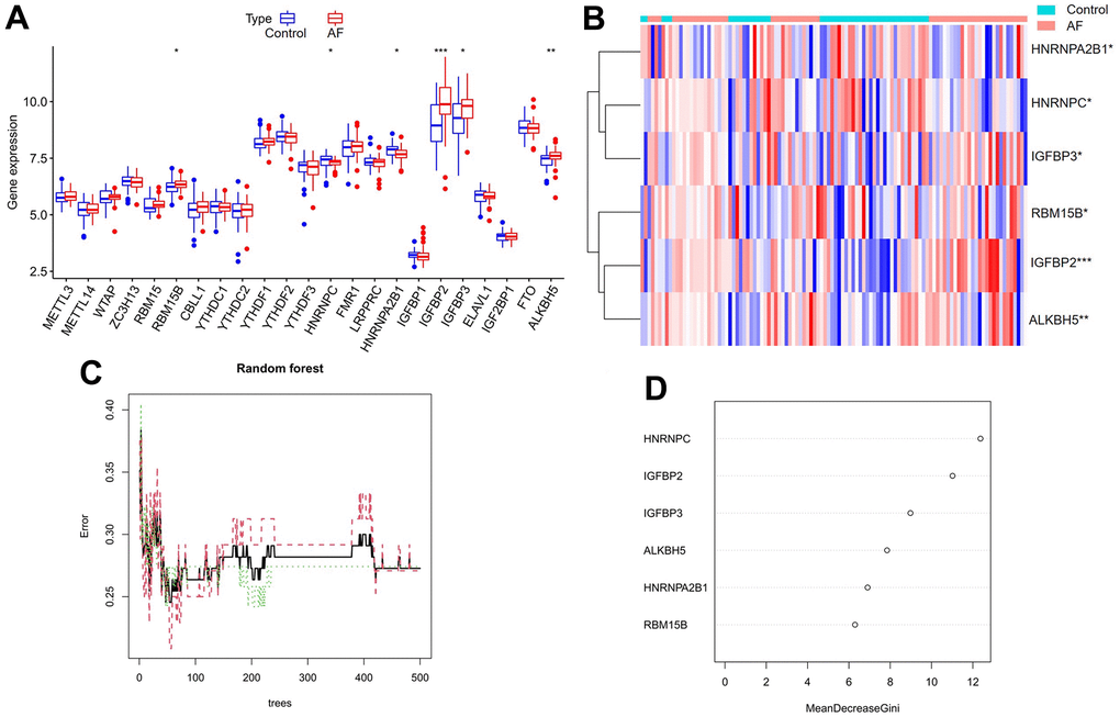 The Wilcoxon test was used to evaluate the expression status differences of 23 m6A regulators between healthy individuals and AF patients. Then, a random forest model was constructed by the “randomForest” package in R and used to identify key m6A regulatory factors. Specifically, the average model error rate of all m6A regulatory factors was calculated, the optimal number of variables of the binary tree in the node was set as 6, and 300 was selected as the optimal number of trees contained in the random forest. Then, the random forest model was constructed, and the decreasing precision method (Gini coefficient method) was used to obtain the dimension importance value from the random forest model. Factors with importance values greater than 2 [39, 40] were selected as key m6A regulators for subsequent model construction.