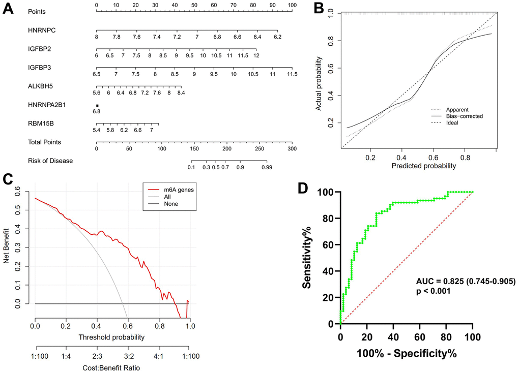 As shown in Figure 3A, a predictive nomogram was constructed based on the expression of six key m6A regulators (RBM15B, IGFBP2, IGFBP3, ALKBH5, HNRNPC and HNRNPA2B1). The calibration curve suggested that the error between the predicted and actual AF risk was very small, suggesting that the nomogram model obtained high accuracy in predicting AF (Figure 3B). Decision curve analysis (DCA) showed that the “nomogram” curve was higher than the gray line, indicating that the nomogram maintains great clinical utility in predicting the morbidity of AF patients (Figure 3C). ROC analysis reconfirmed that the model was effective in distinguishing AF patients from healthy subjects (Figure 3D).