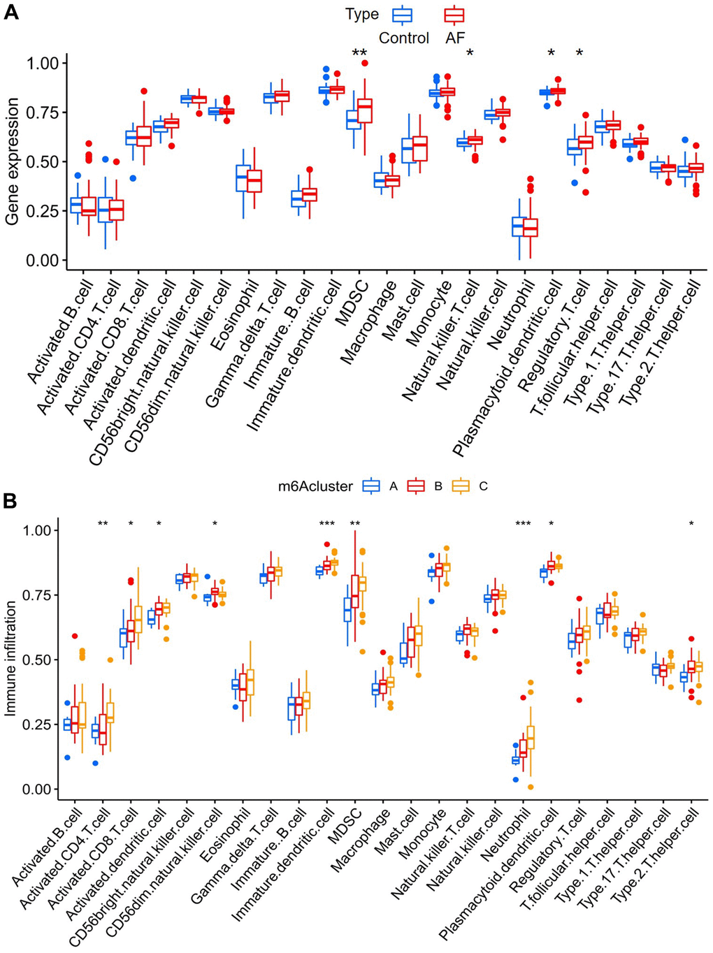 The infiltration of many immunocytes was different between the controls and AF patients (Figure 5A), and among the AF samples with three distinct m6A modification patterns (Figure 5B). We found relatively higher infiltration of myeloid-derived suppressor cells (MDSCs), natural killer T cells, plasmacytoid dendritic cells and regulatory T cells in AF subjects than in SR patients. We also found that there was relatively higher infiltration of activated CD4 T cells, activated CD8 T cells, activated dendritic cells, CD56dim natural killer cells, immature dendritic cells, MDSCs, neutrophils, plasmacytoid dendritic cells and type-2 T helper cells in the m6A cluster-C group than in the m6A cluster-A group (Supplementary Table 3).