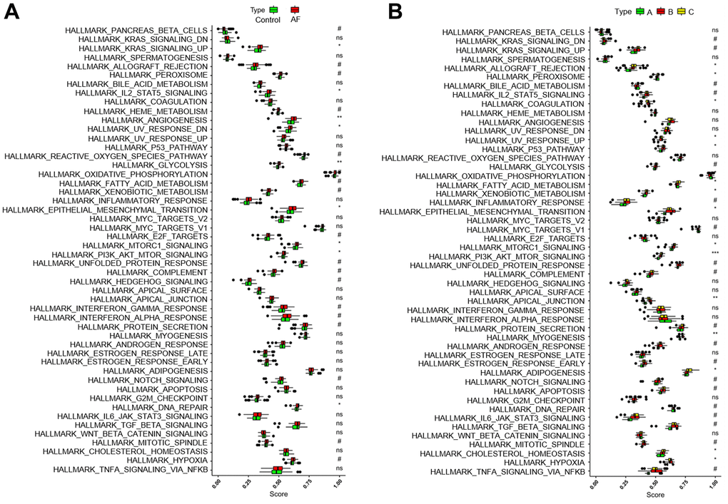 Gene set variation analysis (GSVA) was used to compare the HALLMARKS pathways between the healthy subject and AF patient samples (Figure 6A) and among the AF patient samples with three distinct m6A modification patterns (Figure 6B). Compared with the SR subjects, the AF patients had more enriched pathways, such as KRAS signaling up, IL-2/STAT5 signaling, angiogenesis, UV response down, glycolysis, epithelial mesenchymal transition, mTORC1 signaling, PI3K/Akt/mTOR signaling and DNA repair. Meanwhile, compared with the m6A cluster-A group, the m6A cluster-C group had more enriched pathways, such as allograft rejection, peroxisome, coagulation, UV response up, P53 signaling, fatty acid metabolism, xenobiotic metabolism, epithelial mesenchymal transition, mTORC1 signaling, PI3K/Akt/mTOR signaling, apical junction, myogenesis, adipogenesis, cholesterol homeostasis, and hypoxia (Supplementary Table 4).