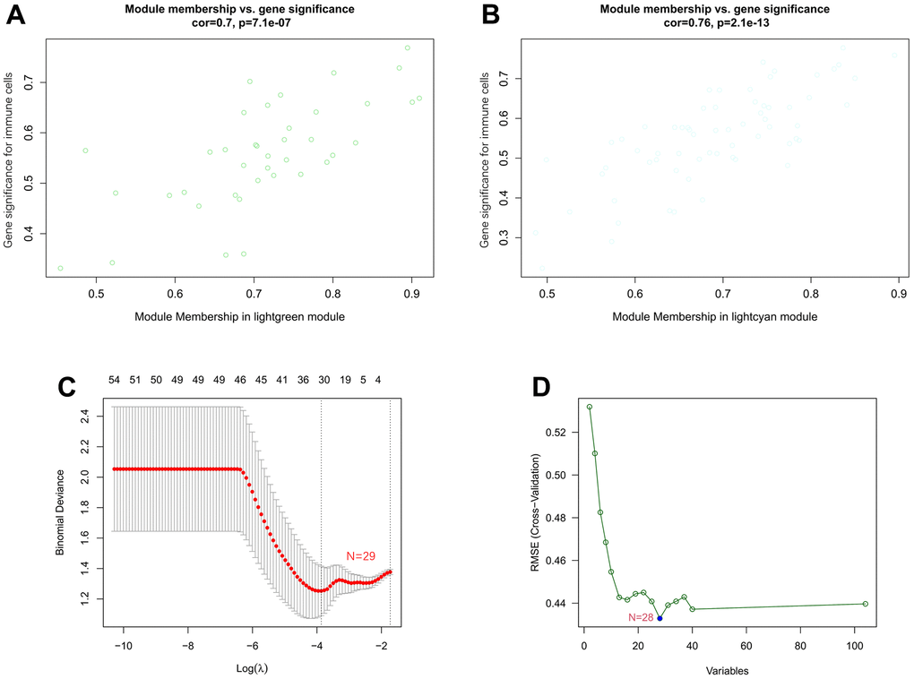 As shown in Supplementary Table 5, a total of 104 genes in the lightcyan and lightgreen modules were included in the KEGG and GO functional enrichment analyses. The top 10 biological processes, cellular components, and molecular functions are shown in Supplementary Figure 2A. The top 10 KEGG pathways are shown in Supplementary Figure 2B. A total of 104 genes were mainly enriched in the following immune-related biological processes: leukocyte-mediated immunity, positive regulation of leukocyte activation, positive regulation of cell activation, adaptive immune response based on somatic recombination of immune receptors built from immunoglobulin superfamily domains, leukocyte cell-cell adhesion, activation of immune response, leukocyte activation involved in the immune response and cell activation involved in the immune response. In addition, the details of GO and KEGG analyses are presented in Supplementary Tables 6, 7.